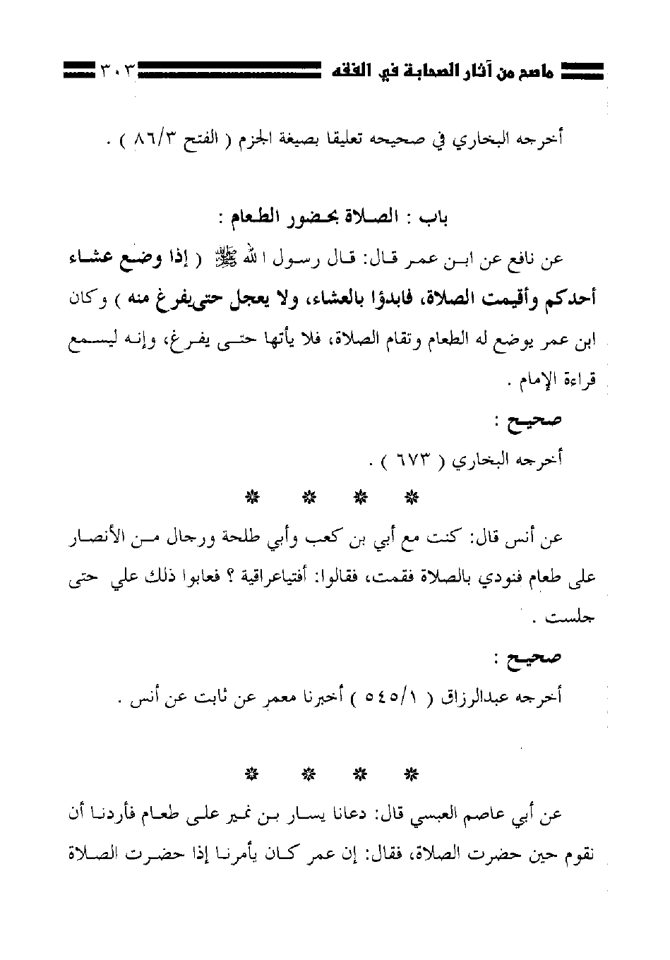 عن نافع عن ابن عمر قال: قال رسول الله - صلى الله عليه وسلم - (إذا وضع عشاء أحدكم وأقيمت الصلاة، فابدؤا بالعشاء، ولا يعجل حتي يفرغ منه) وكان ابن عمر يوضع له الطعام وتقام الصلاة، فلا يأتها حتى يفرغ، وإنه ليسمع قراءة الإمام.