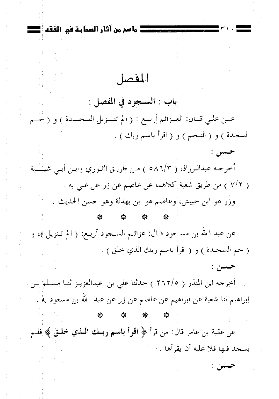 عن علي قال: العزائم أربع: (الم تنزيل السجدة) و (حم السجدة) و (النجم) و (اقرأ باسم ربك).