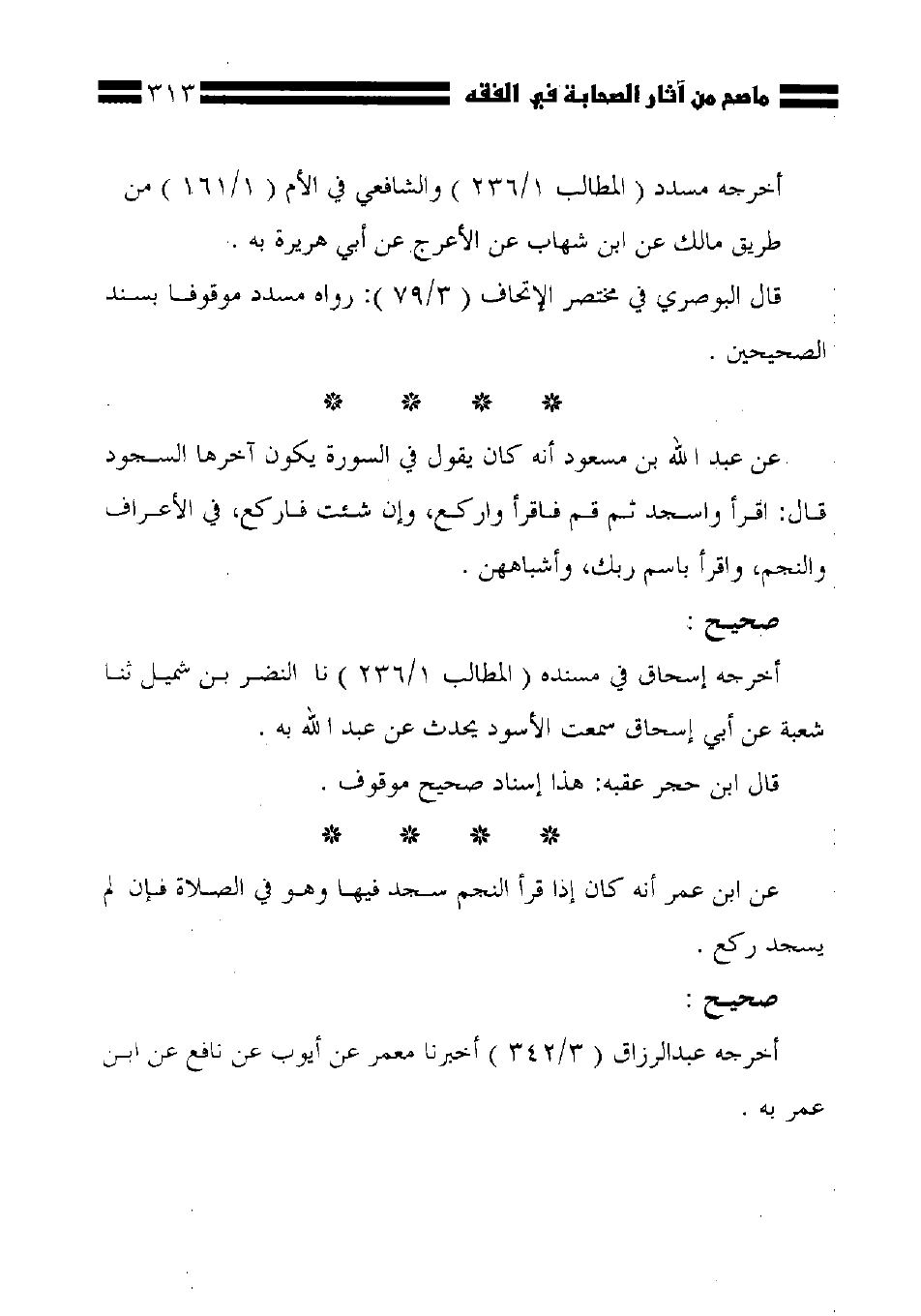 عن عبد الله بن مسعود أنه كان يقول في السورة يكون آخرها السجود قال: اقرأ واسجد ثم قم فاقرأ واركع، وإن شئت فاركع، في الأعراف والنجم، واقرأ باسم ربك، وأشباههن.
