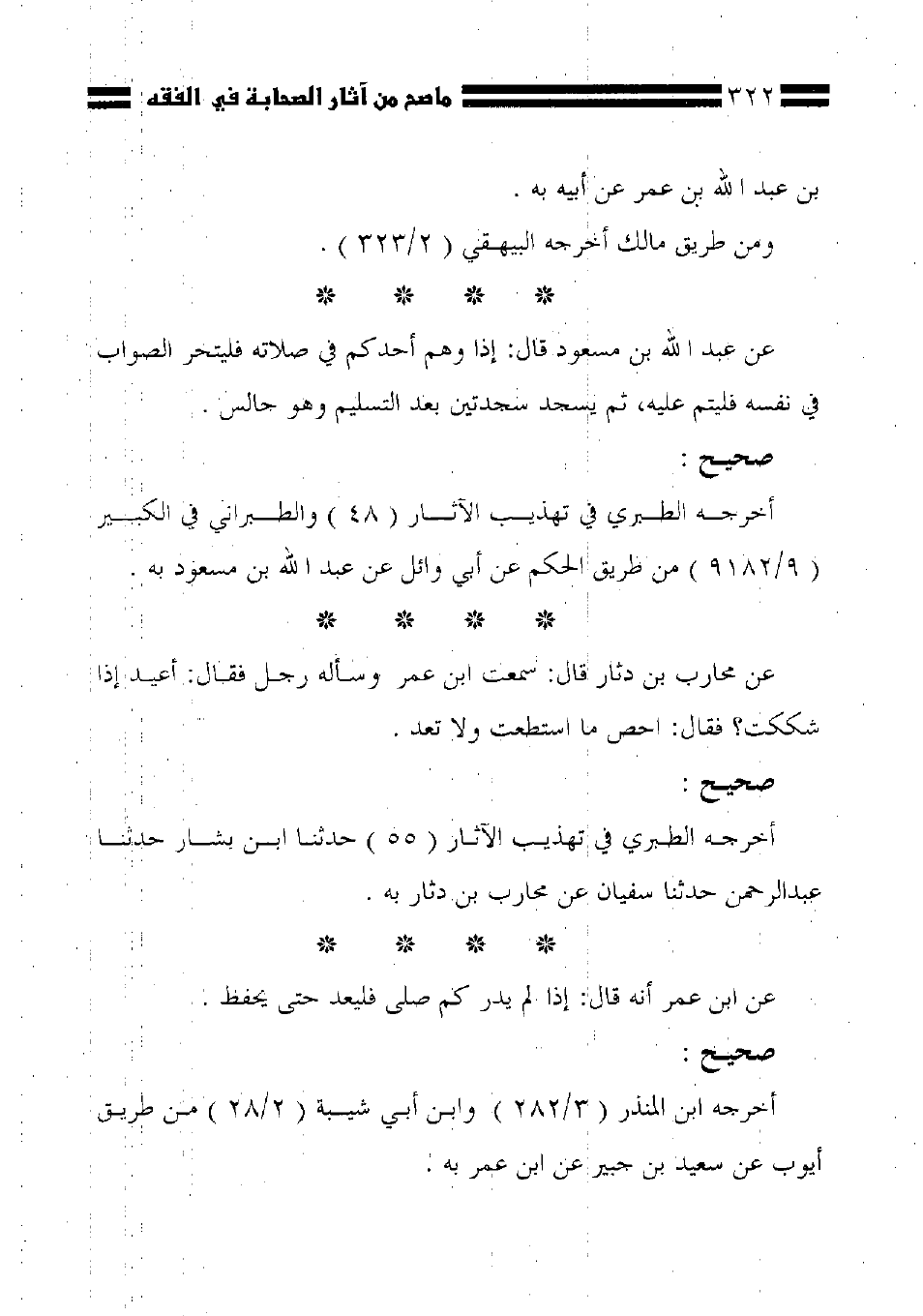 عن محارب بن دثار قال: سمعت ابن عمر وسأله رجل فقال. أعيد إذا شككت؟ فقال: احص ما استطعت ولا تعد.