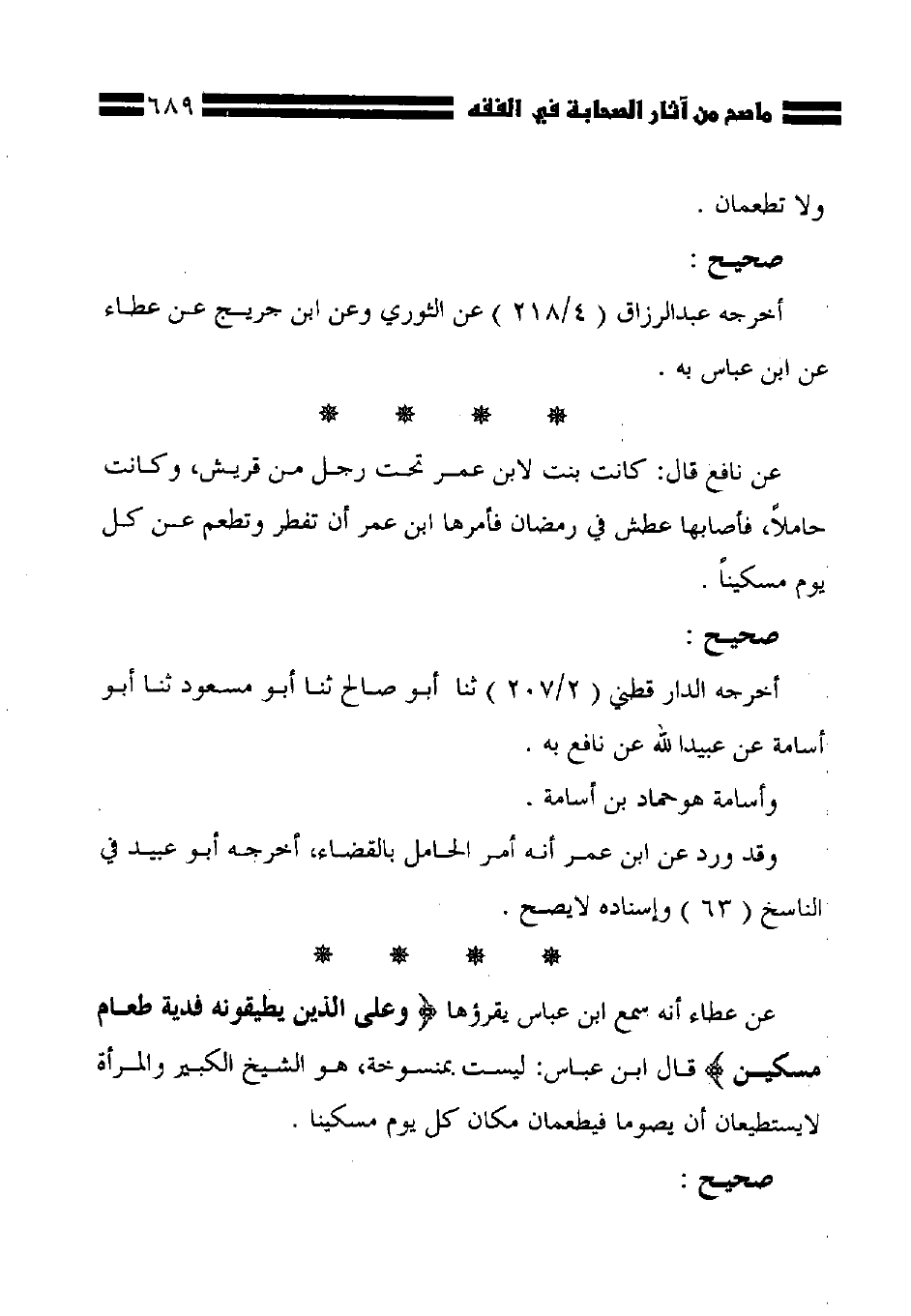 عن نافع قال: كانت بنت لابن عمر تحت رجل من قريش، وكانت حاملاً، فأصابها عطش في رمضان فأمرها ابن عمر أن تفطر وتطعم عن كل يوم مسكيناً.