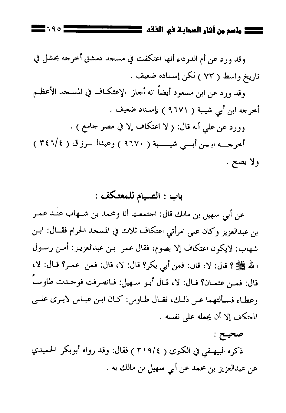 عن أبي سهيل بن مالك قال: احتمعت أنا ومحمد بن شهاب عند عمر بن عبد العزيز وكان على امرأتي اعتكاف ثلاث في المسجد الحرام فقال: ابن شهاب: لا يكون اعتكاف إلا بصوم، فقال عمر بن عبد العزيز: أمن رسول الله - صلى الله عليه وسلم -؟ قال: لا، قال: فمن أبي بكر؟ قال: لا، قال: فمن عمر؟ قال: لا، قال: فمن عثمان؟ قال: لا، قال أبو سهيل: فانصرفت فوجدت طاوساً وعطاء فسألتهما عن ذلك، فقال طاوس: كان ابن عباس لا يرى على المعتكف إلا أن يجعله على نفسه.