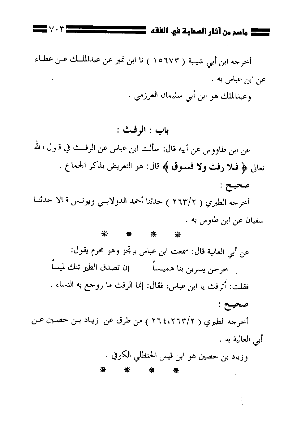 عن ابن طاووس عن أبيه قال: سألت ابن عباس عن الرفث في قول الله تعالى {فَلَا رَفَثَ وَلَا فُسُوقَ} قال: هو التعريض بذكر الجماع.