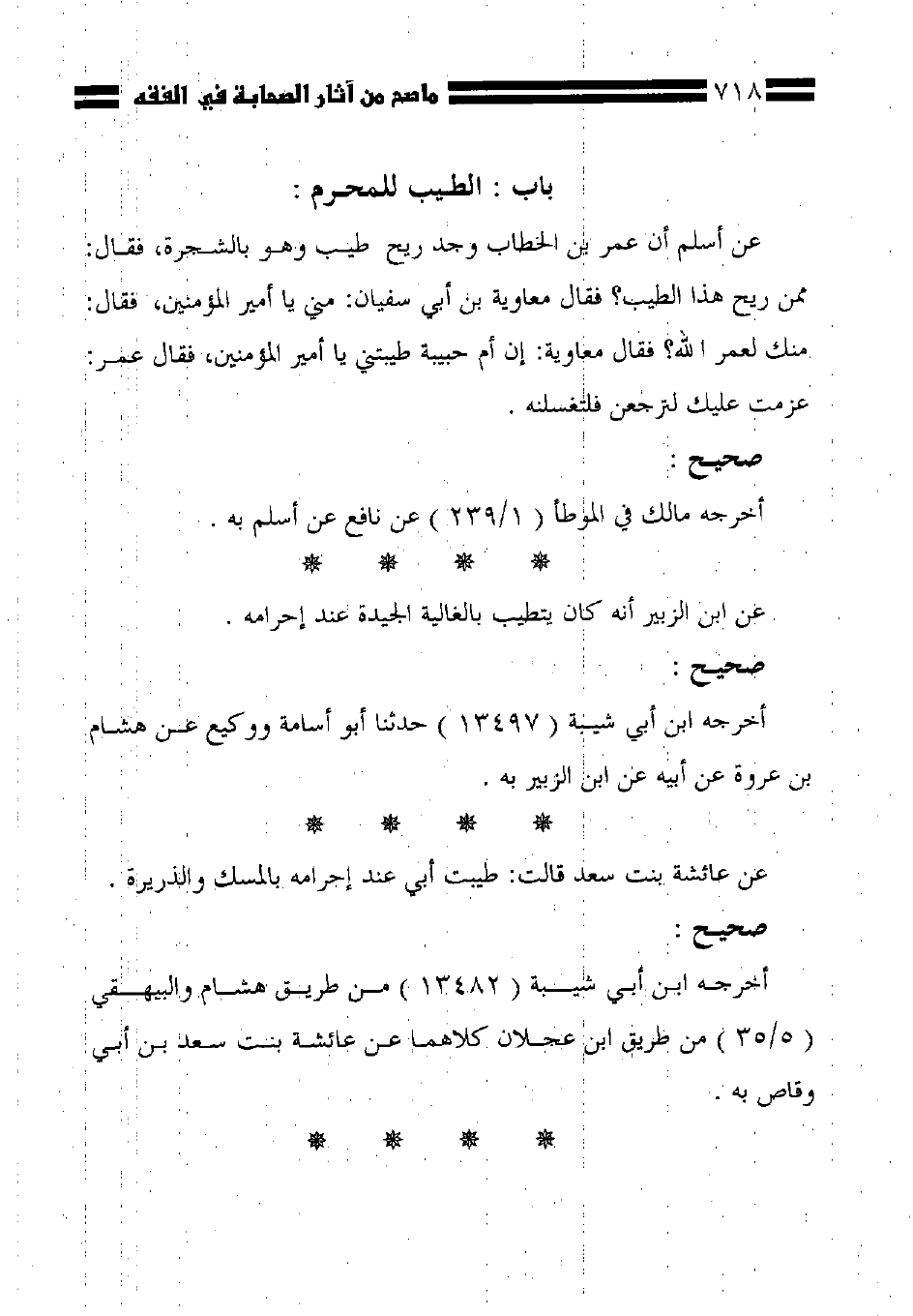 عن أسلم أن عمر بن الخطاب وجد ريح طيب وهو بالشجرة، فقال: ممن ريح هذا الطيب؟ فقال معاوية بن أبي سفيان: مني يا أمير المؤمنين، فقال: منك لعمر الله؟ فقال معاوية: إن أم حبيبة طيبتني يا أمير المؤمنين، فقال عمر: عزمت عليك لترجعن فلتغسلنه.