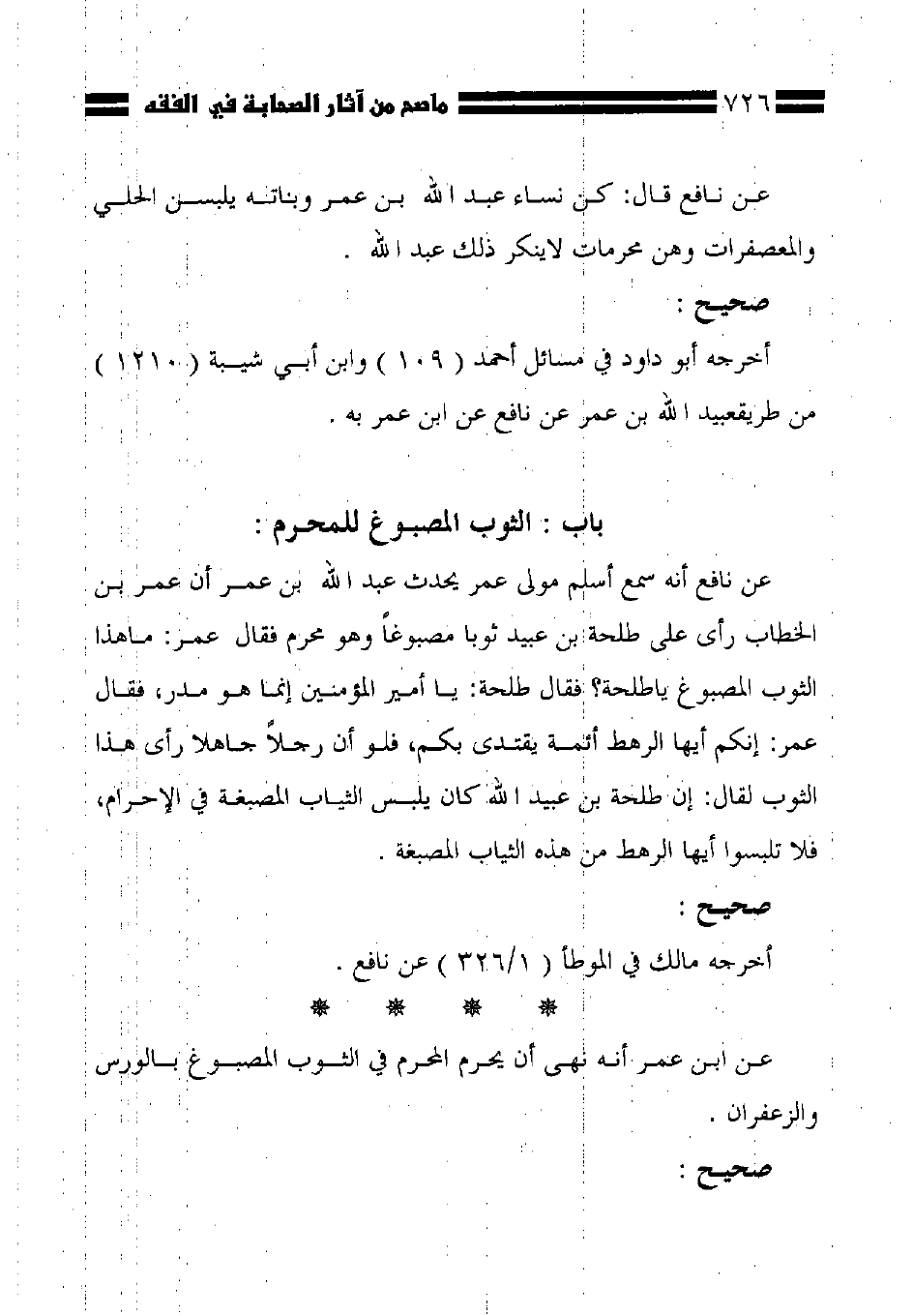عن نافع قال: كن نساء عبد الله بن عمر وبناته يلبسن الحلي والمعصفرات وهن محرمات لا ينكر ذلك عبد الله.