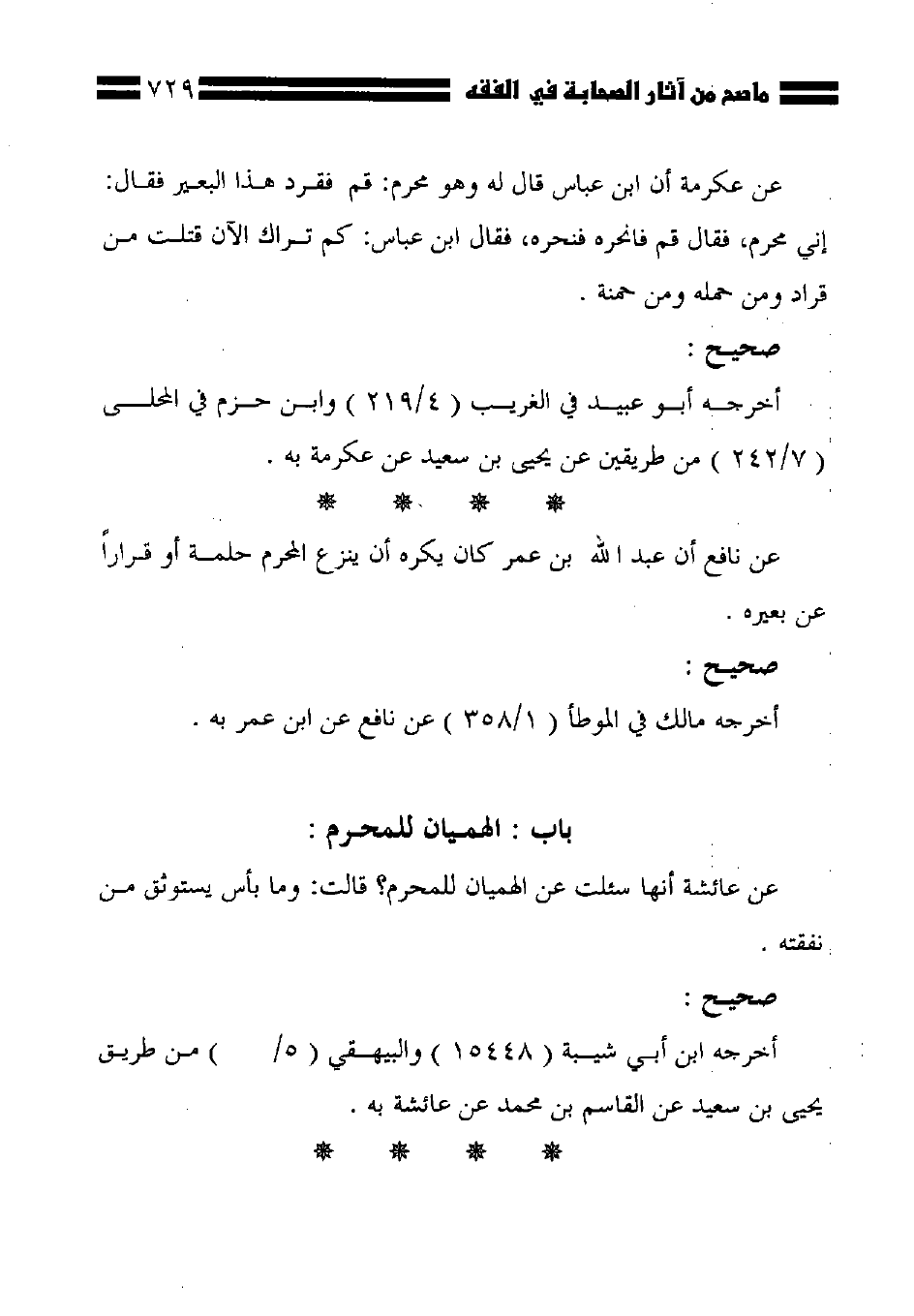 عن عكرمة أن ابن عباس قال له وهو محرم: قم فقرد هذا البعير فقال: إني محرم، فقال قم فانحره فنحره، فقال ابن عباس: كم تراك الآن قتلت من قراد ومن حمله ومن حمنة.