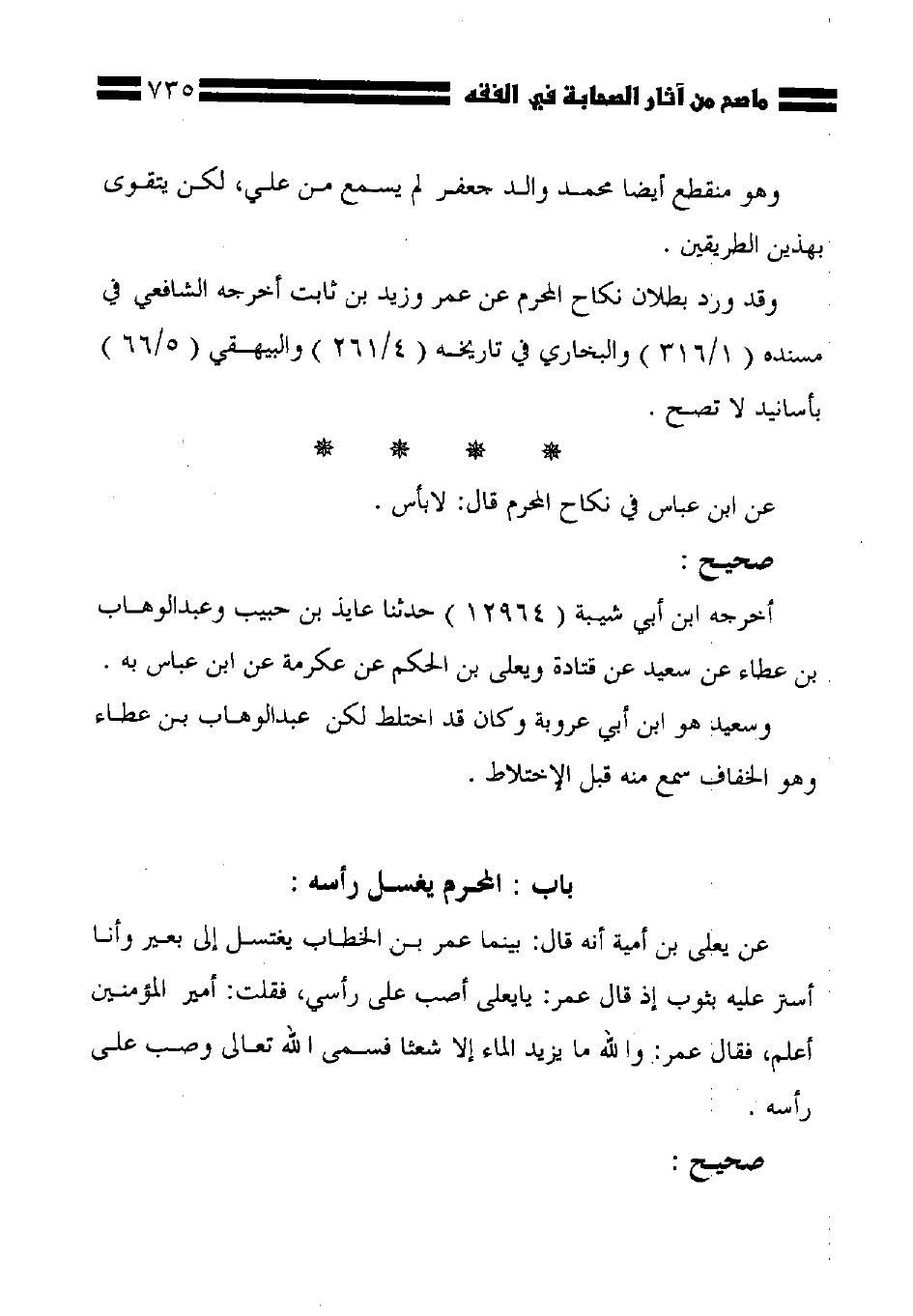 وقد ورد بطلان نكاح المحرم عن عمر وزيد بن ثابت أخرجه الشافعي في مسنده (1/ 316) والبخاري في تاريخه (4/ 261) والبيهقي (5/ 66) بأسانيد لا تصح.