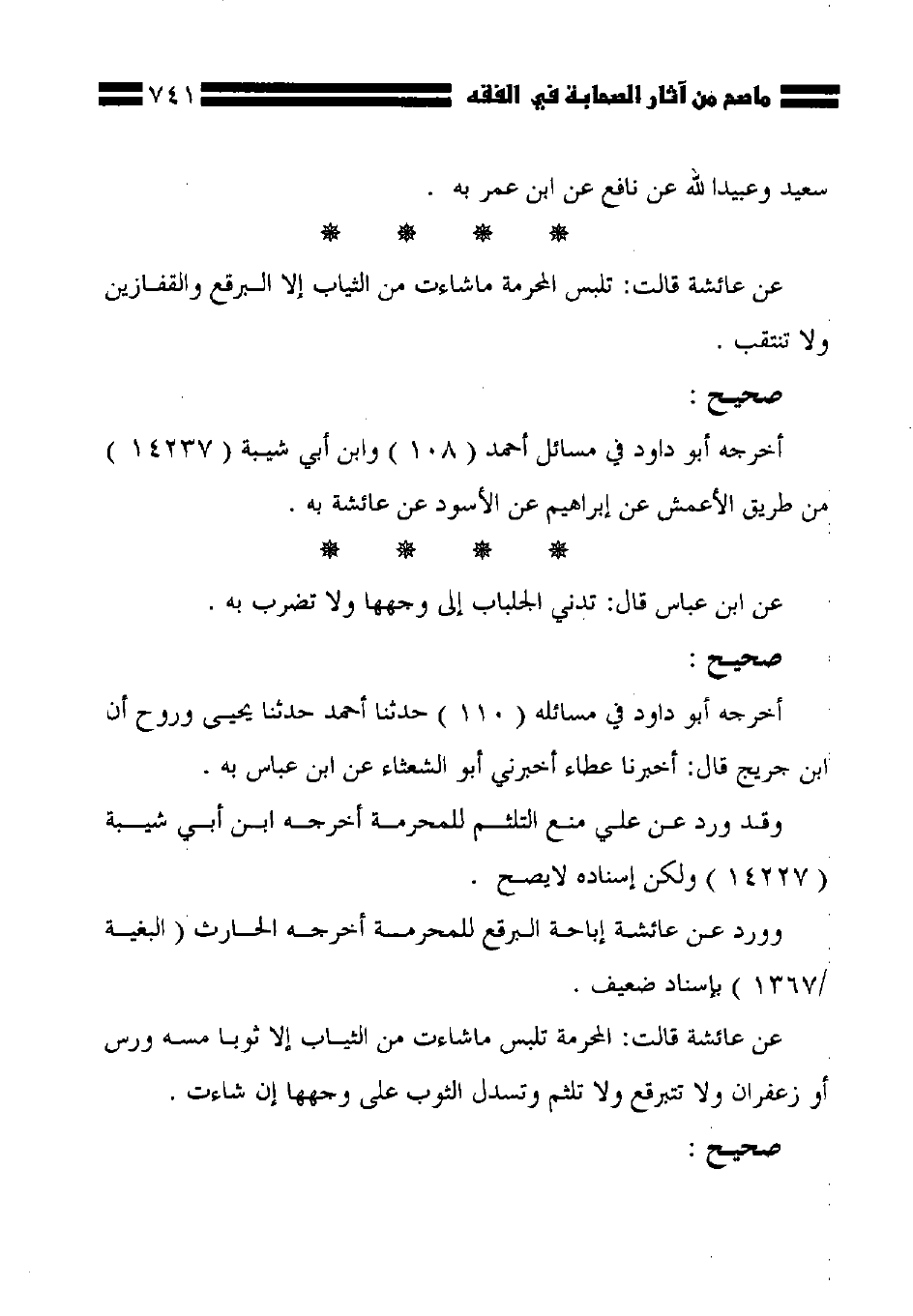 عن عائشة قالت: تلبس المحرمة ما شاءت من الثياب إلا البرقع والقفازين ولا تنتقب.