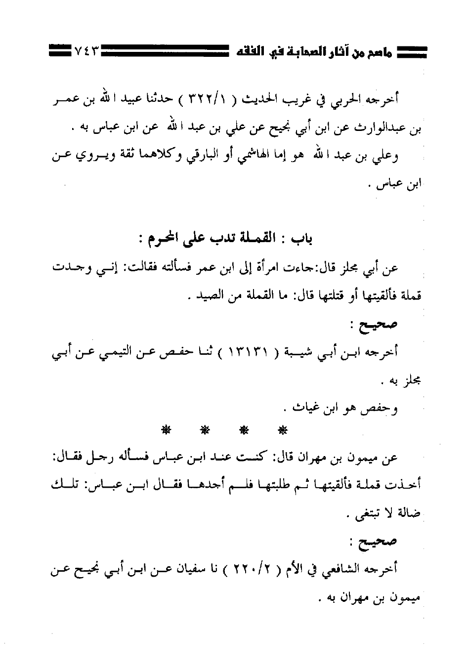 عن ميمون بن مهران قال: كنت عند ابن عباس فسأله رجل فقال: أخذت قملة فألقيتها ثم طلبتها فلم أجدها فقال ابن عباس: تلك ضالة لا تبتغى.