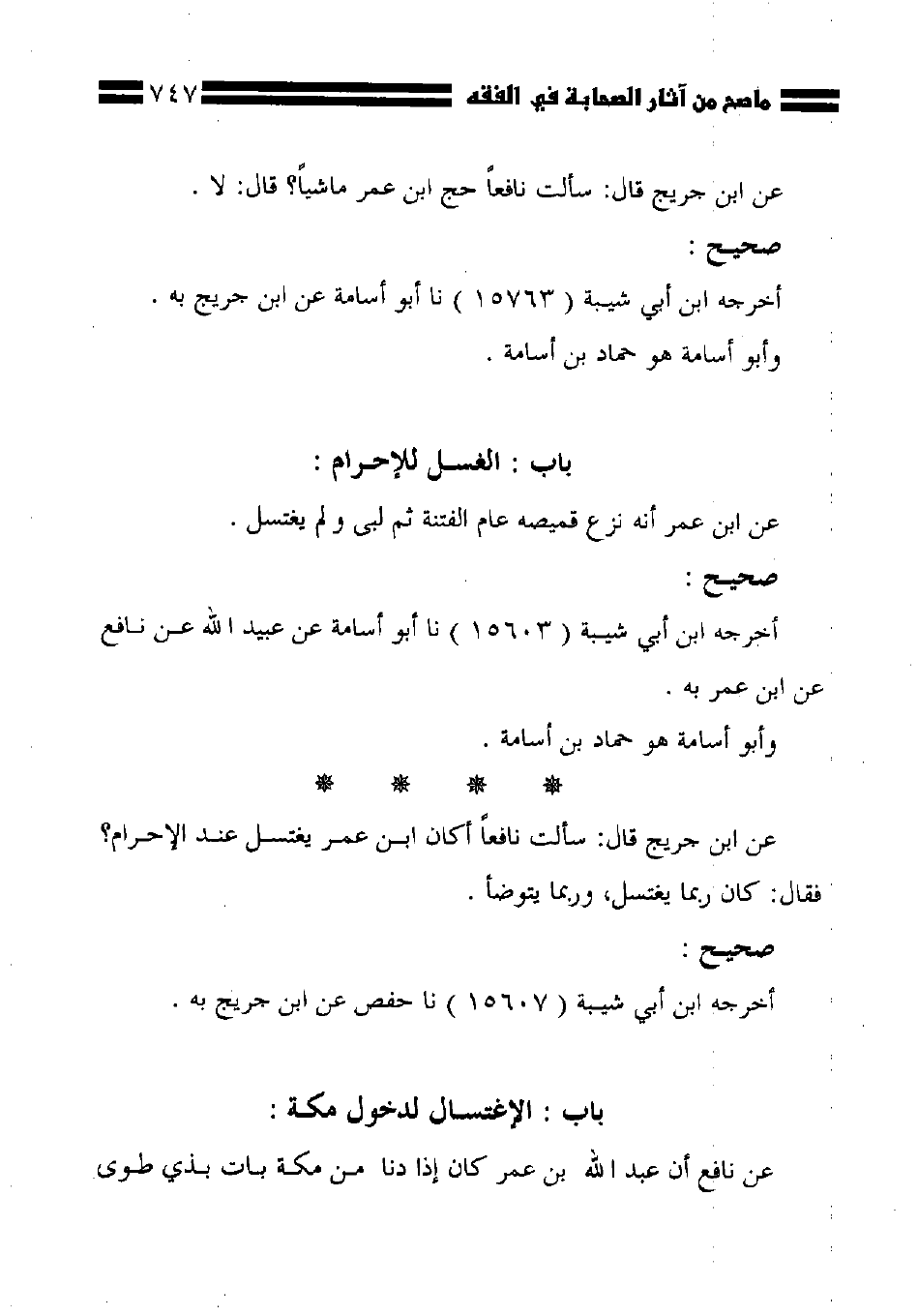 عن ابن جريج قال: سألت نافعاً أكان ابن عمر يغتسل عند الإحرام؟ فقال: كان ربما يغتسل، وربما يتوضأ.