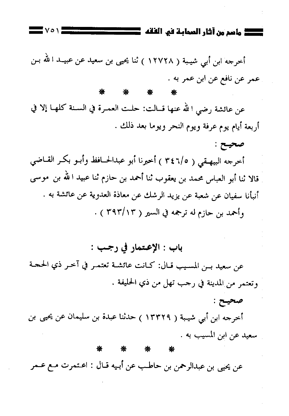 عن سعيد بن المسيب قال: كانت عائشة تعتمر في آخر ذي الحجة وتعتمر من المدينة في رجب تهل من ذي الحليفة.
