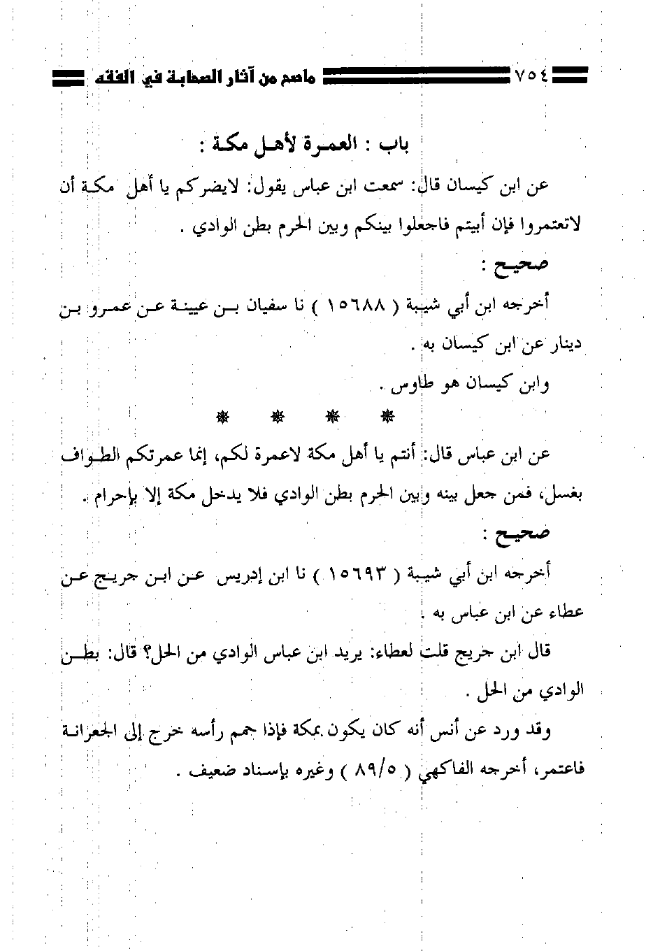 عن ابن عباس قال: أنتم يا أهل مكة لا عمرة لكم، إنما عمرتكم الطواف بغسل، فمن جعل بينه وبين الحرم بطن الوادي فلا يدخل مكة إلا بإحرام.