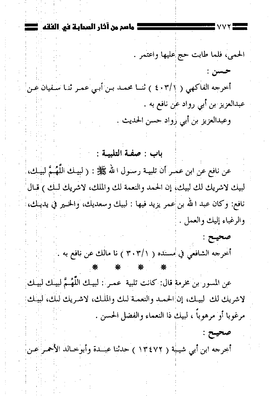 عن المسور بن مخرمة قال: كانت تلبية عمر: لبيك اللَّهُمَّ لبيك لبيك لا شريك لك لبيك، إن الحمد والنعمة لك والملك، لا شريك لك، لبيك مرغوبا أو مرهوباً، لبيك ذا النعماء والفضل الحسن.