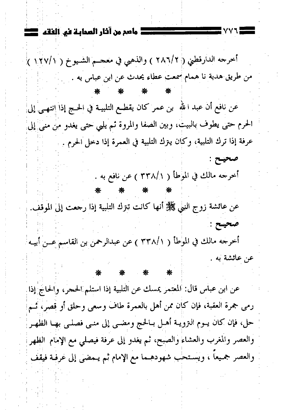 عن نافع أن عبد الله بن عمر كان يقطع التليية في الحج إذا انتهى إلى الحرم حتى يطوف بالبيت، وبين الصفا والمروة ثم يلبي حتى يغدو من منى إلى عرفة إذا ترك التلبية، وكان يترك التلبية في العمرة إذا دخل الحرم.