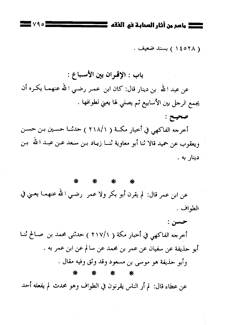 عن عبد الله بن دينار قال: كان ابن عمر - رضي الله عنهما - يكره أن يجمع الرجل بين الأسابيع ثم يصلي لها يعني لطوافها.