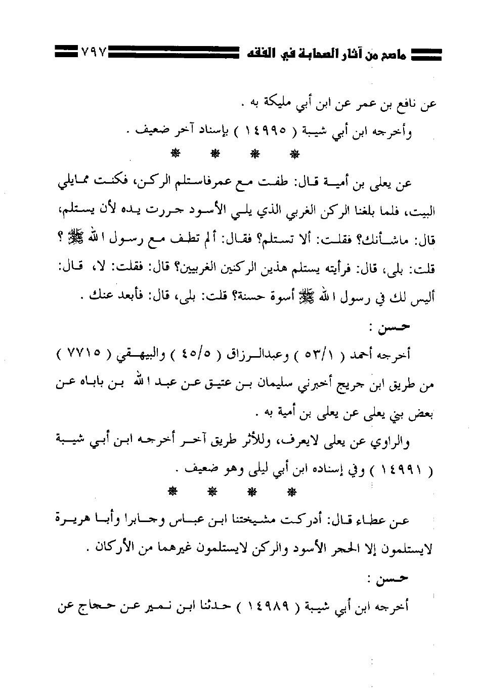 عن عطاء قال: أدركت مشيختنا ابن عباس وجابراً وأبا هريرة لا يستلمون إلا الحجر الأسود والركن لا يستلمون غيرهما من الأركان.