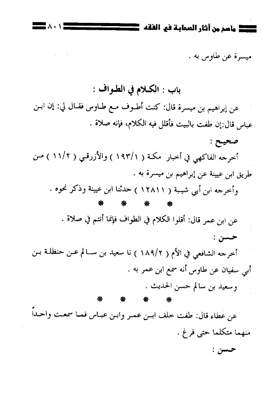 عن إبراهيم بن ميسرة قال: كنت أطرف مع طاوس فقال لي: إن ابن عباس قال: إن طفت بالبيت فأقلل فيه الكلام، فإنه صلاة.