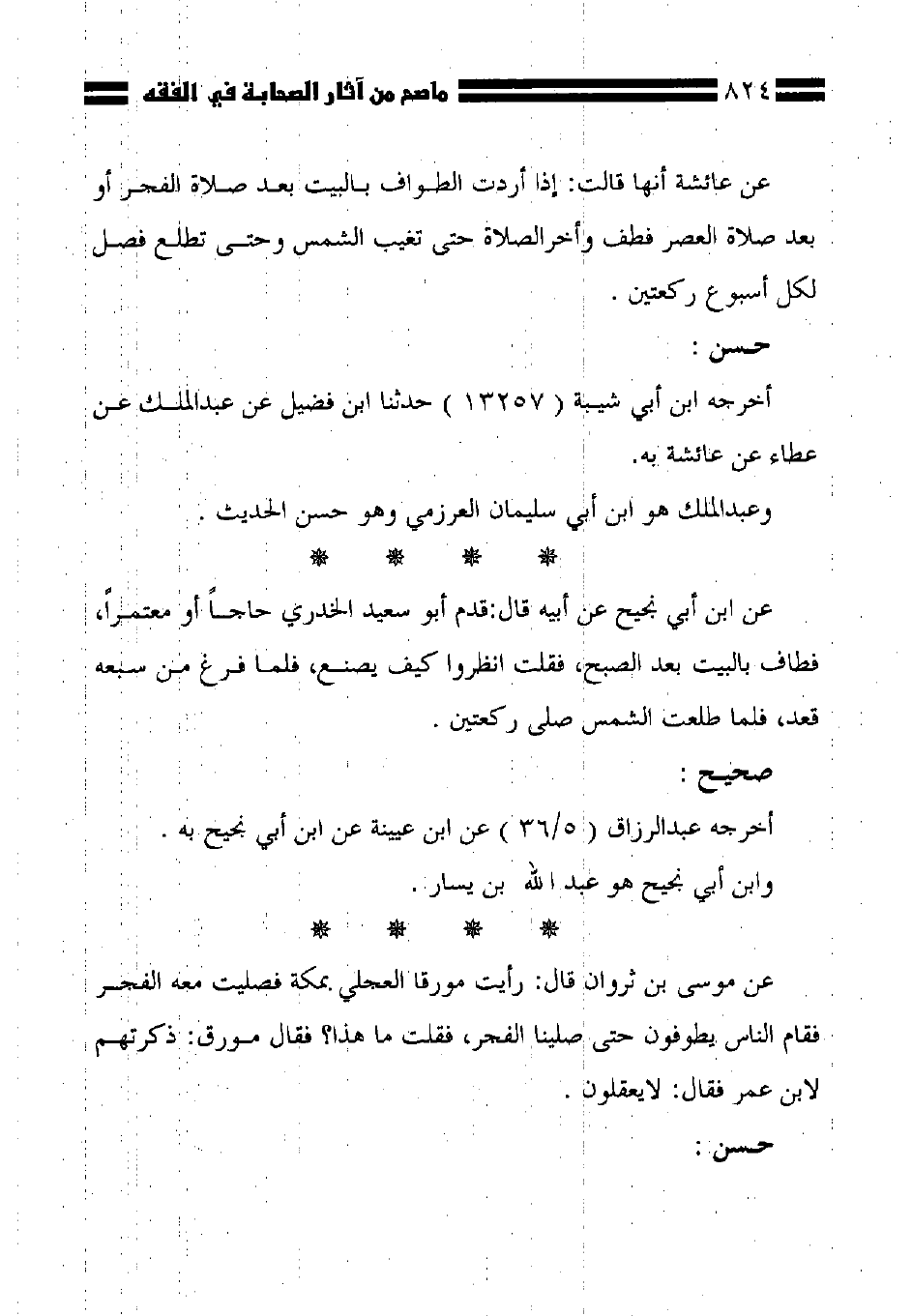 عن عائشة أنها قالت: إذا أردت الطواف بالبيت بعد صلاة الفجر أو بعد صلاة العصر فطف وأخر الصلاة حتى تغيب الشمس وحتى تطلع فصل لكل أسبوع ركعتين.
