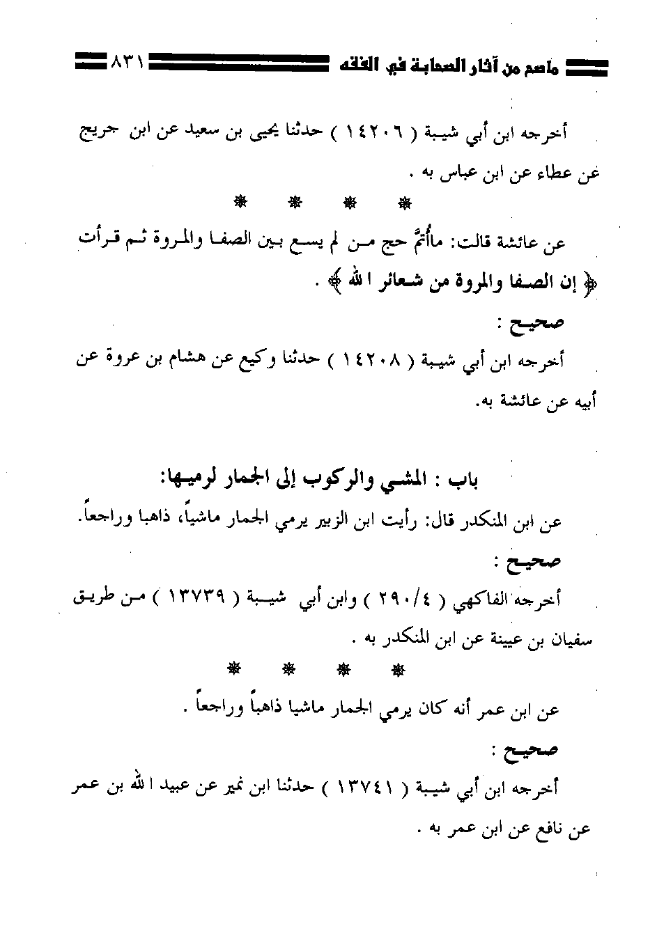 عن ابن المنكدر قال: رأيت ابن الزبير يرمي الجمار ماشيًا، ذاهبا وراجعًا.
