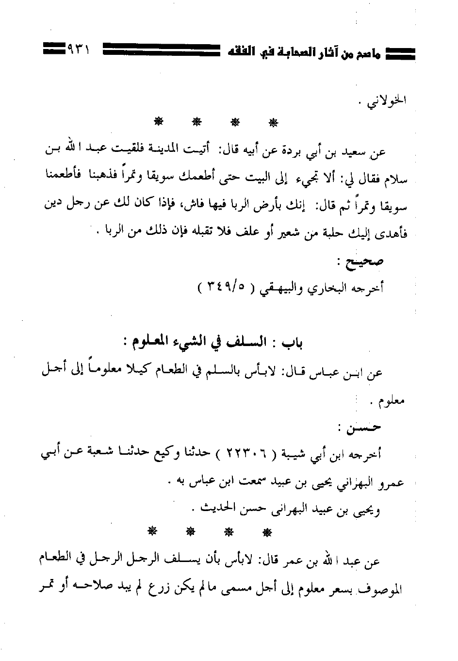 عن سعيد بن أبي بردة عن أبيه قال: أتيت المدينة فلقيت عبد الله بن سلام فقال لي: ألا تجيء إلى البيت حتى أطعمك سويقا وتمرًا فذهبنا فأطعمنا سويقا وتمرًا ثم قال: إنك بأرض الربا فيها فاش، فإذا كان لك عن رجل دين فأهدى إليك حلبة من شعير أو علف فلا تقبله فإن ذلك من الربا.
