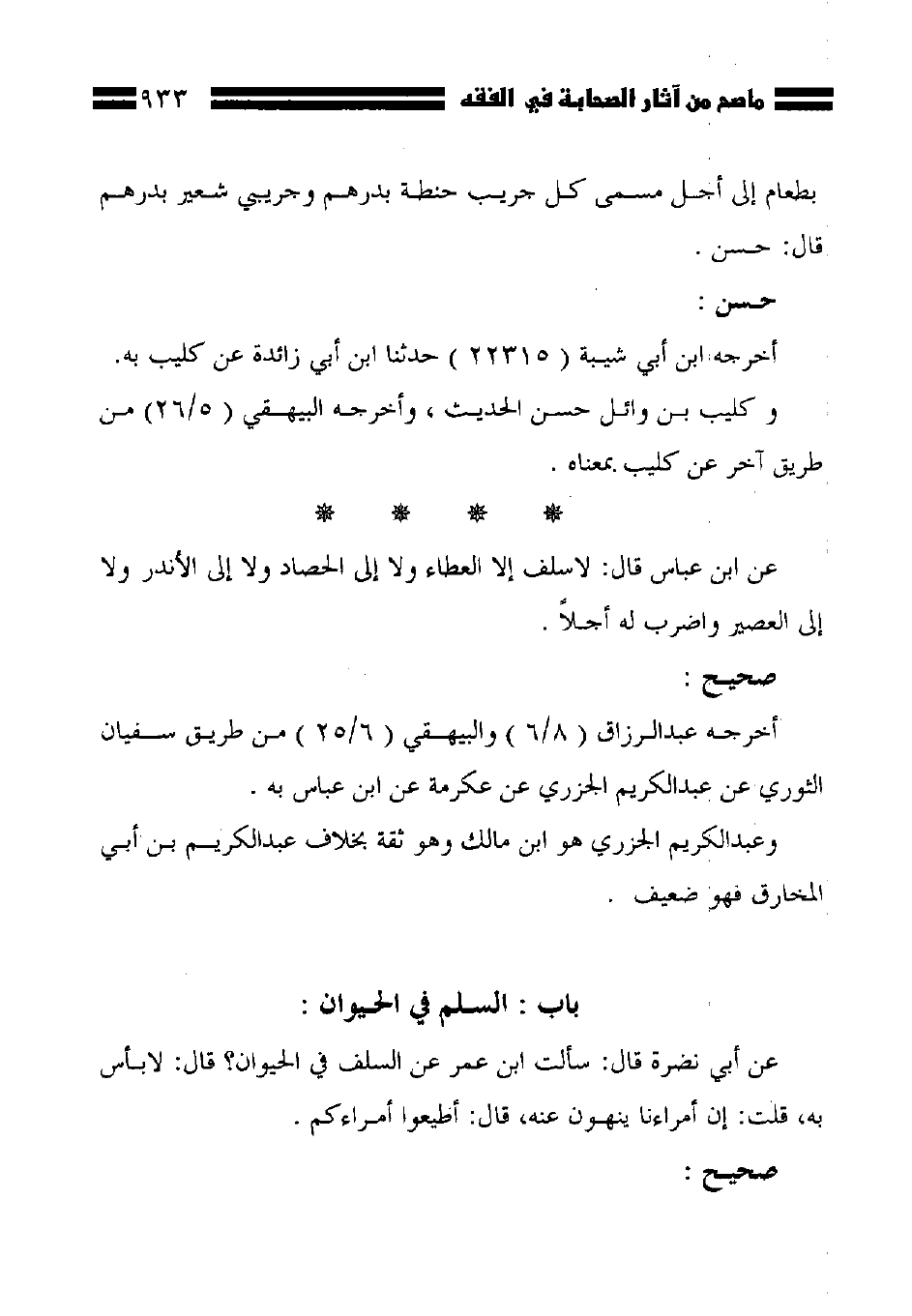 عن أبي نضرة قال: سألت ابن عمر عن السلف في الحيوان؟ قال: لا بأس به، قلت: إن أمراءنا ينهون عنه، قال: أطيعوا أمراءكم.