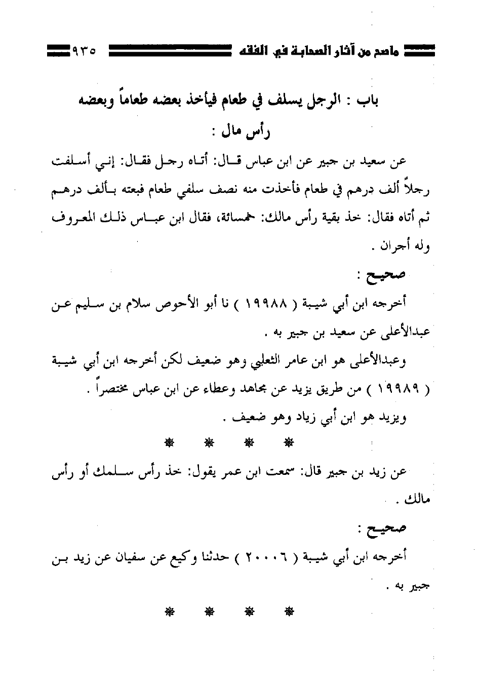 عن سعيد بن جبير عن ابن عباس قال: أتاه رجل فقال: إني أسلفت رجلًا ألف درهم في طعام فأخذت منه نصف سلفي طعام فبعته بألف درهم ثم أتاه فقال: خذ بقية رأس مالك: خمسائة، فقال ابن عباس ذلك المعروف وله أجران.