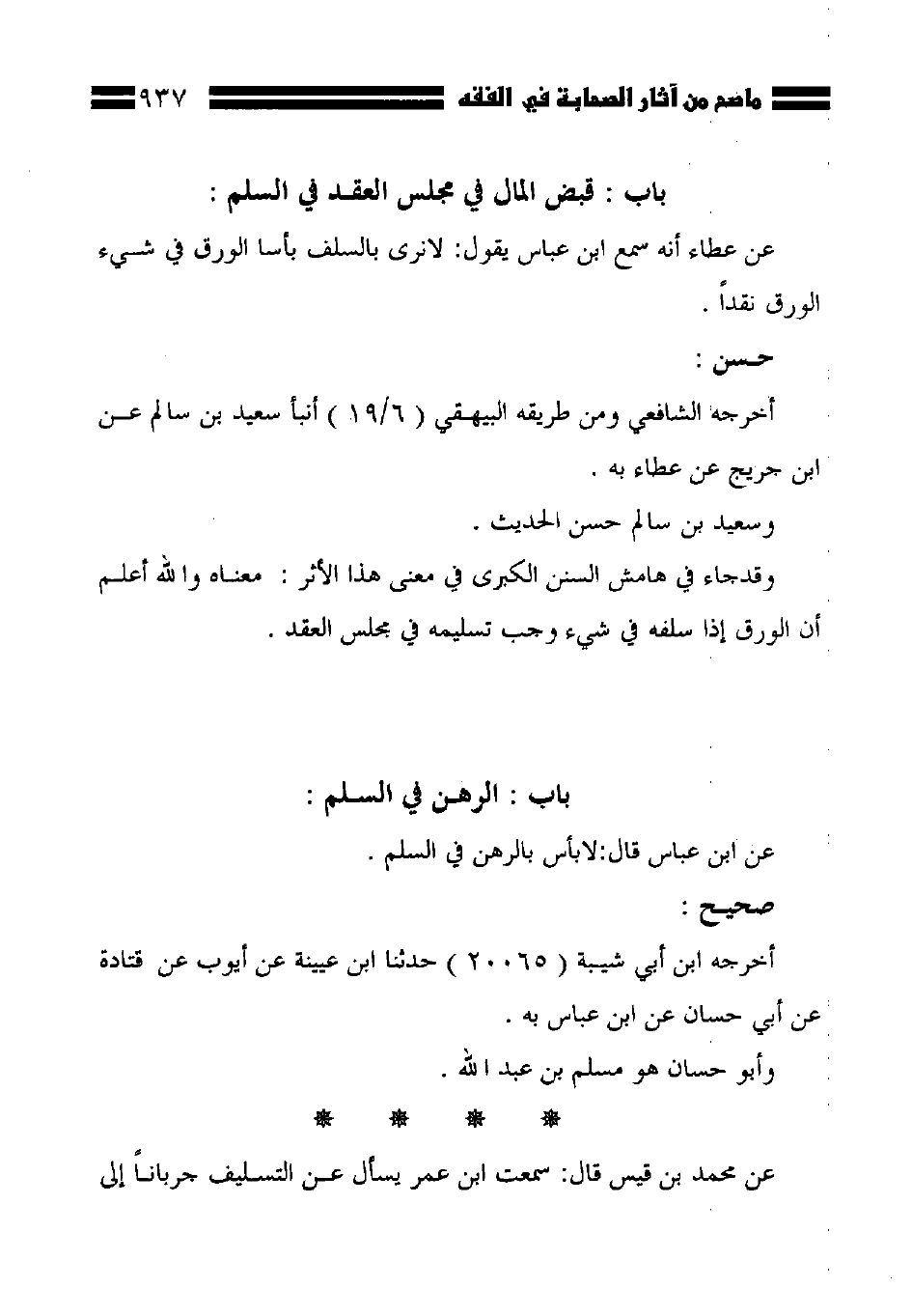 عن عطاء أنه سمع ابن عباس يقول: لانرى بالسلف بأسا الورق في شيء الورق نقدًا.