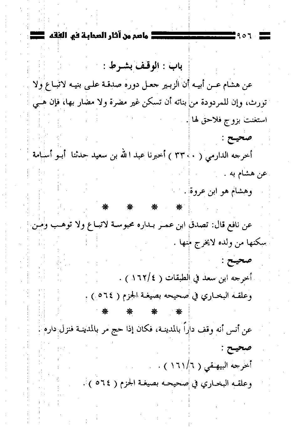 عن هشام عن أبيه أن الزبير جعل دوره صدقة علي بنيه لا تباع ولا تورث، وإن للمردودة من بناته أن تسكن غير مضرة ولا مضار بها، فإن هي استغنت بزوج فلا حق لها.