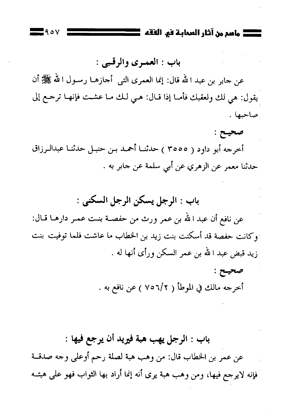 عن نافع أن عبد الله بن عمر ورث من حفصة بنت عمر دارها قال: وكانت حفصة قد أسكنت بنت زيد بن الخطاب ما عاشت فلما توفيت بنت زيد قبض عبد الله بن عمر السكن ورأى أنها له.