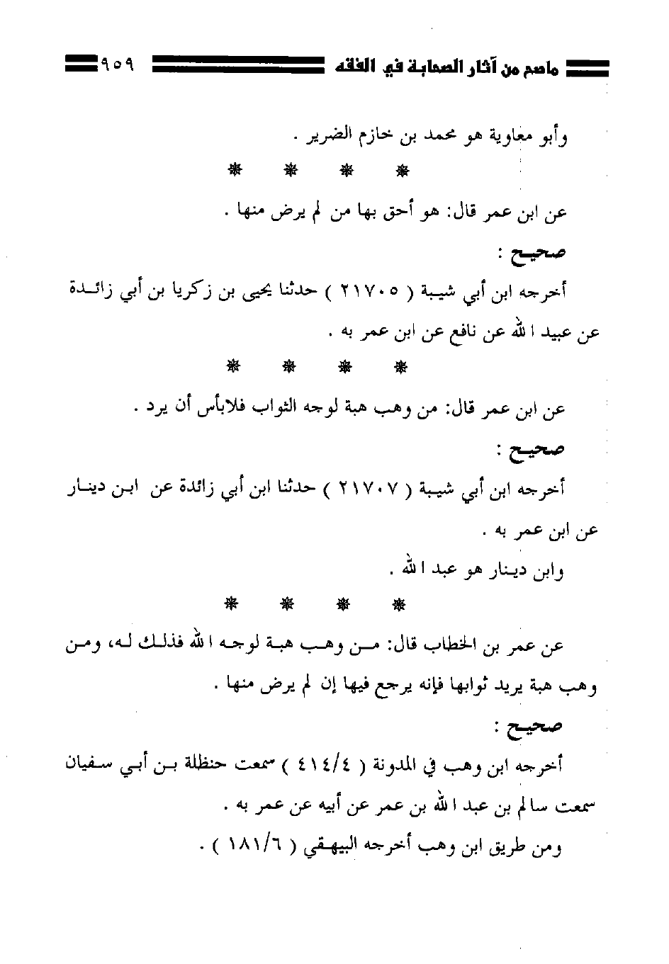 عن ابن عمر قال: من وهب هبة لوجه الثواب فلا بأس أن يرد.