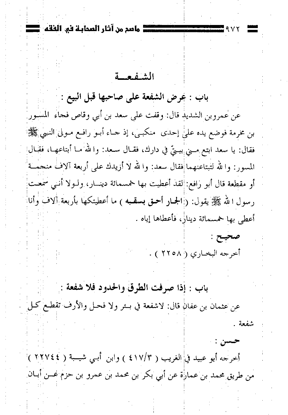 عن عمرو بن الشديد قال: وقفت على سعد بن أبي وقاص فجاء المسور بن نحرمة فوضع يده على إحدى منكبي، إذ جاء أبو رافع مولى النبي - صلى الله عليه وسلم - فقال: يا سعد ابتع مني بيتيّ في دارك، فقال سعد: والله ما أبتاعها، فقال المسور: والله لتبتاعنهما فقال سعد: والله لا أزيدك على أربعة آلاف منجمة أو مقطعة قال أبو رافع: لقد أعطت بها خمسمائة دينار، ولولا أني سمعت رسول الله - صلى الله عليه وسلم - يقول: (الجار أحق بسقبه) ما أعطتكها بأربعة آلاف وأنا أعطى بها خمسمائة دينار، فأعطاها إياه.