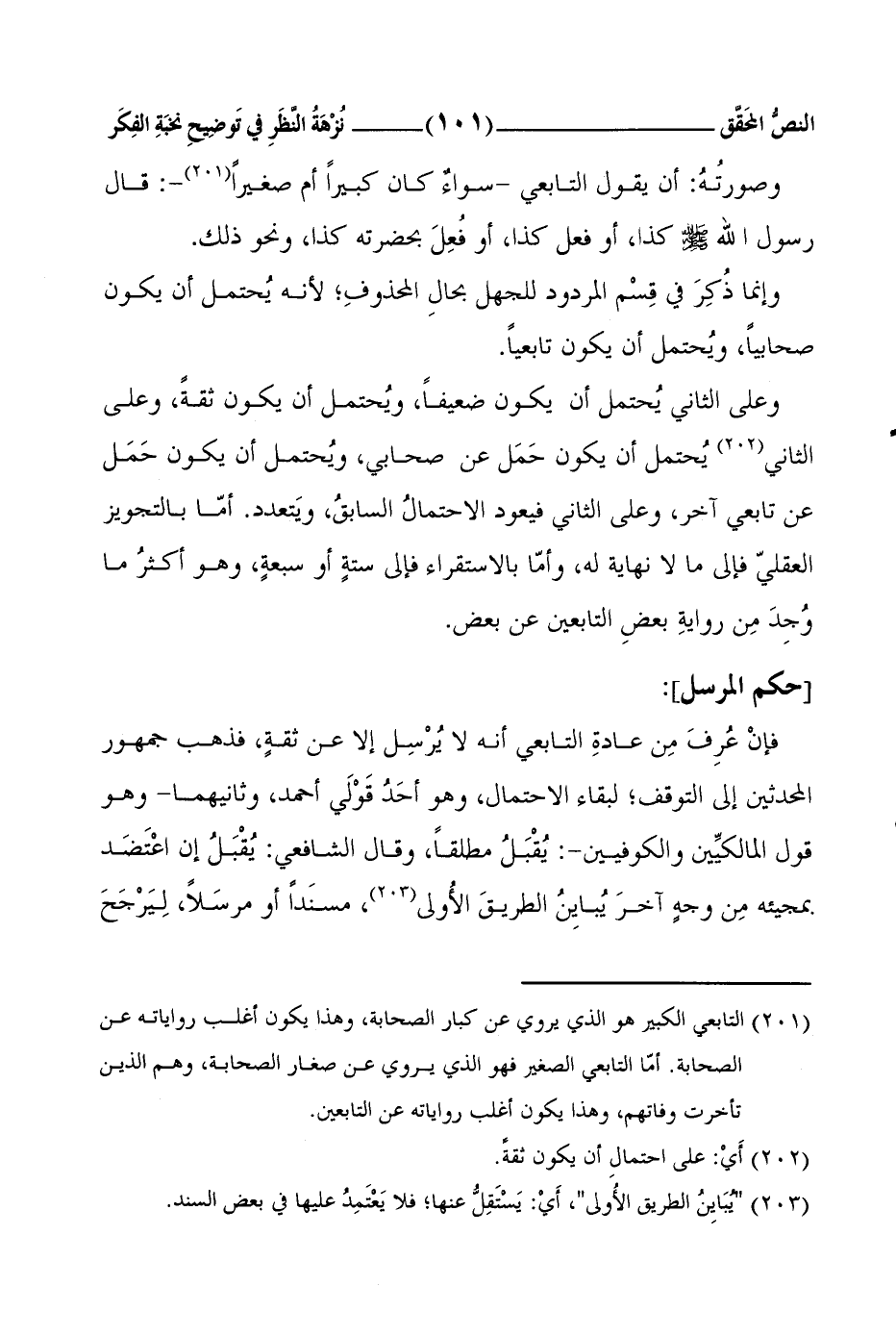 وعلى الثَّاني يُحتمل أَنْ يكونَ ضَعيفاً، ويُحتمل أَنْ يكونَ ثقةً، وعلى الثَّاني2 يُحتمل أَنْ يكونَ حَمَل عن صحابيٍّ، ويُحتمل أَنْ يكونَ حَمَل عن تابعيٍّ آخَرَ، وعلى الثَّاني فيعودُ الاحتمالُ السابقُ، ويَتعدد. أَمَّا بالتَّجويزِ العقليِّ فإِلى ما لا نهايةَ لهُ، وأَمَّا بالاستقراءِ فإِلى ستةٍ أَو سبعةٍ، وهو أكثرُ ما وُجِدَ مِن روايةِ بعضِ التابعين عن بعض.