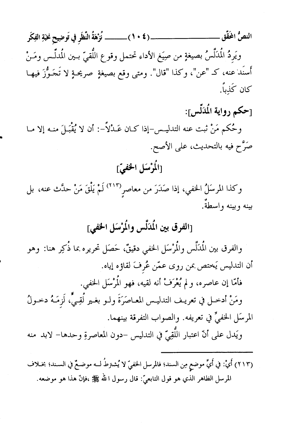 ومَنْ أَدْخَلَ في تعريفِ التَّدليسِ المعاصَرَةَ ولو بغيرِ لُقِيٍّ، لَزِمَهُ دخولُ المرسَل الخفيِّ في تعريفِهِ. والصَّوابُ التَّفرقةُ بينَهُما.