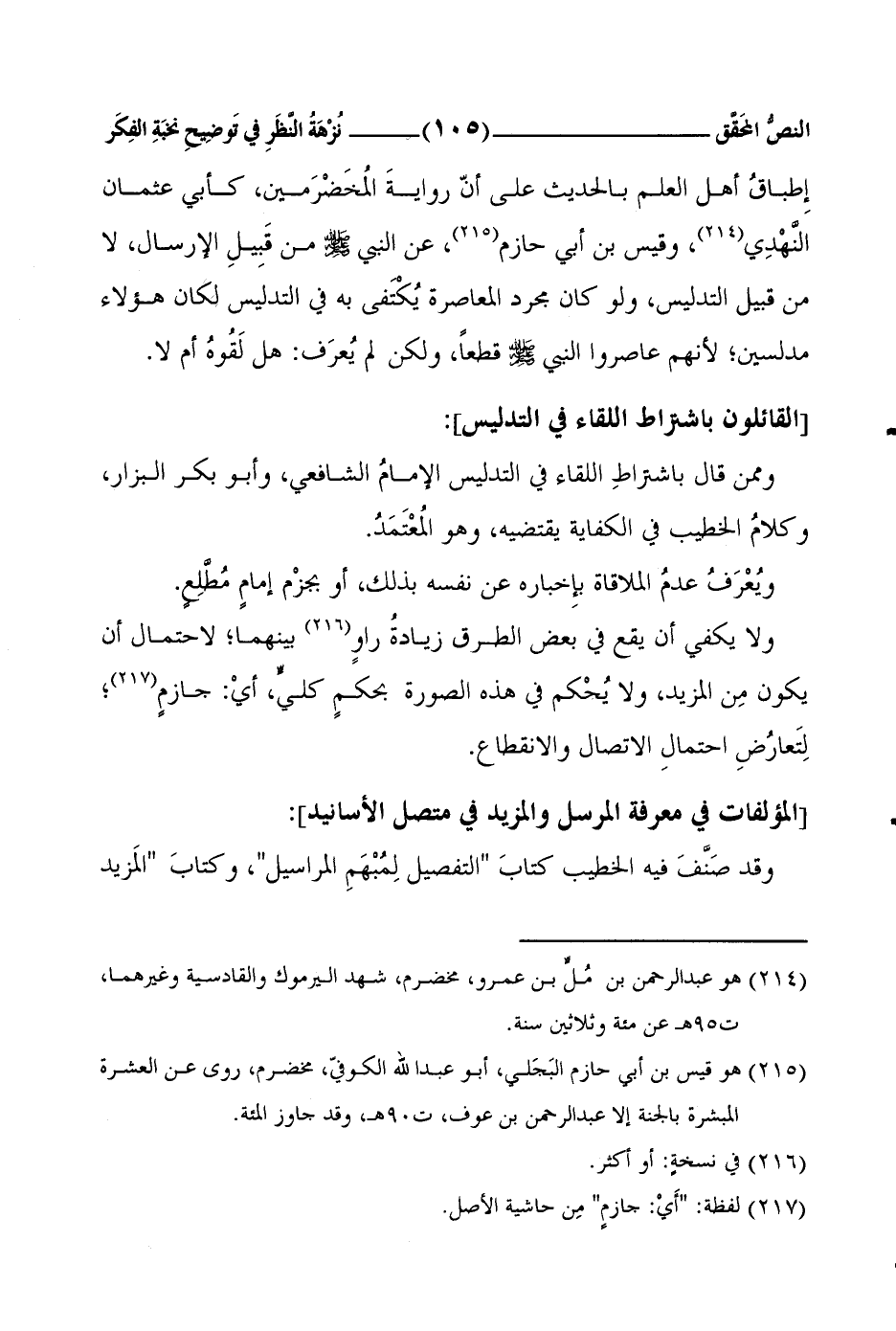 ولا يَكْفي أَنْ يَقَعَ في بعض الطرق زيادةُ راوٍ1 بينَهُما؛ لاحتمال أَنْ يكونَ مِن المزيدِ، ولا يُحْكم في هذه الصورة بحكمٍ كليٍّ، أيْ: جازمٍ2؛ لِتَعارُضِ احتمالِ الاتصال والانقطاع.