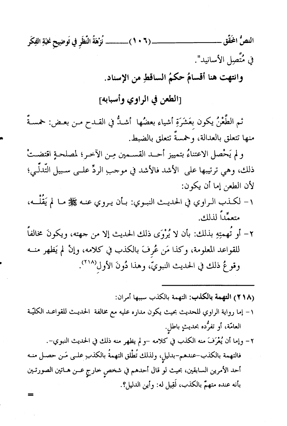 ثم الطَّعْنُ يكون بِعَشَرَةِ أشياء بعضُها أشدُّ في القَدْحِ مِن بعضٍ: خمسةٌ منها تتعلَّقُ بالعدالَةِ، وخمسةٌ تتعلَّقُ بالضَّبْطِ.
