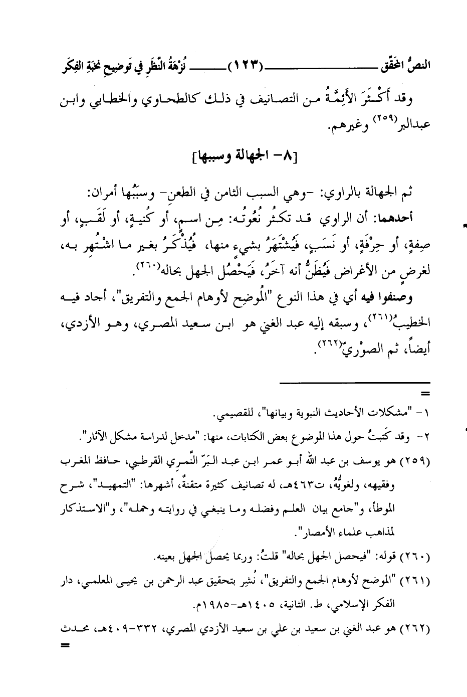 ثمَّ الجَهالةُ بالرَّاوِي: -وهِيَ السَّببُ الثَّامِنُ في الطعنِ- وسبَبُها أمران: