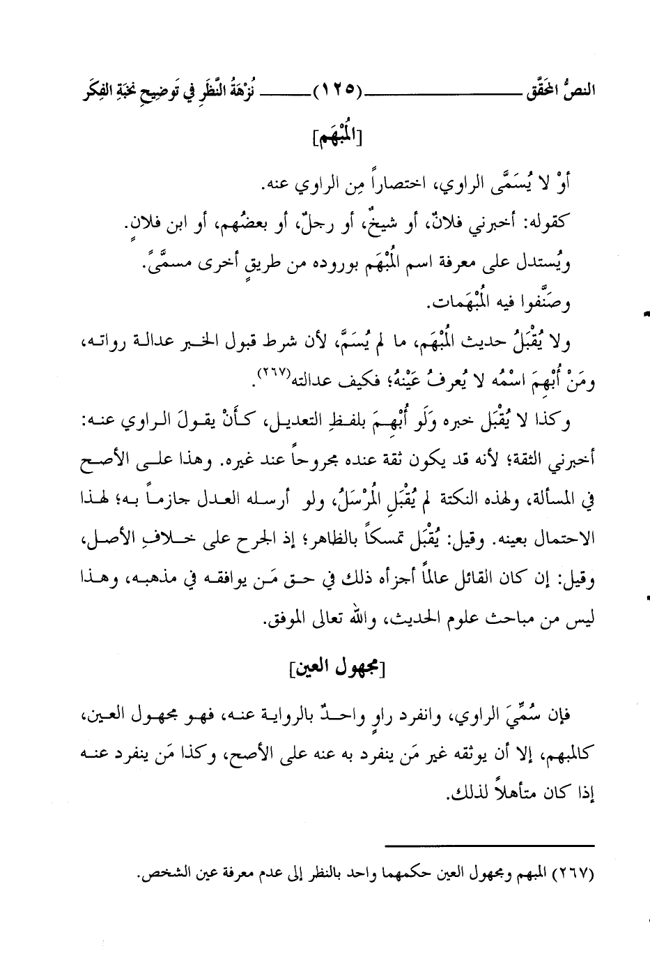 وكذا لا يُقْبَل خبره وَلَو أُبْهِمَ بلفظِ التَّعْديلِ، كأَنْ يقولَ الرَّاوي عنهُ: أَخْبَرَني الثِّقُة؛ لأنَّهُ قد يكونُ ثقةً عندَه مجروحاً عندَ غيرِه. وهذا عَلى الأصَحِّ في المسألة، ولهذه النكتة لم يُقْبَلِ المُرْسَلُ، ولو أَرسَلَهُ العدلُ جازِماً بهِ؛ لهذا الاحتمالِ بعينِه. وقيلَ: يُقْبَل تمسُّكاً بالظَّاهِرِ؛ إِذ الجَرْحُ على خلافِ الأصل، وقيل: إن كان القائل عالماً أجزأه ذلك في حق مَن يوافِقُهُ في مَذْهَبِهِ، وهذا ليسَ مِن مباحث علوم الحديث، والله تعالى الموفق.