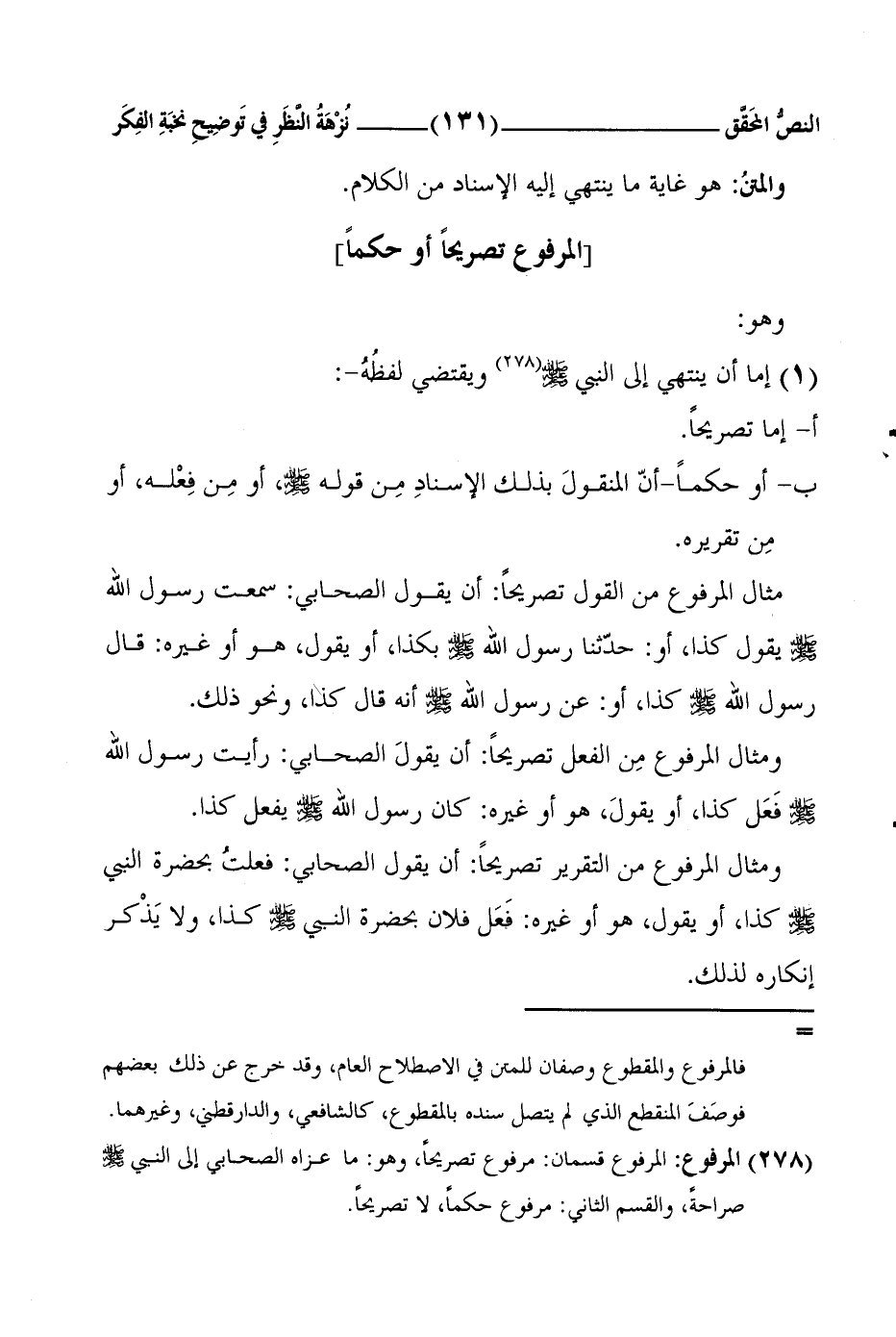 1 المرفوع: المرفوع قسمان: مرفوع تصريحاً، وهو: ما عزاه الصحابي إلى النبي صلى الله عليه وسلم صراحةً، والقسم الثاني: مرفوع حكماً، لا تصريحاً.
