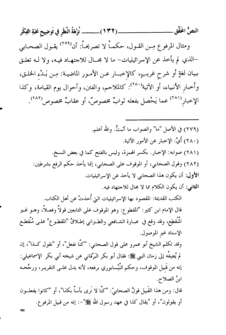 قال: ومن هذا القَبيل قولُ الصحابيّ: كنَّا لا نَرى بأساً بكذا، أو كانوا يفعلون أو يقولون، أو يقال كذا في عهد رسول الله صلى الله عليه وسلم-: إنه من قبيل المرفوع. =