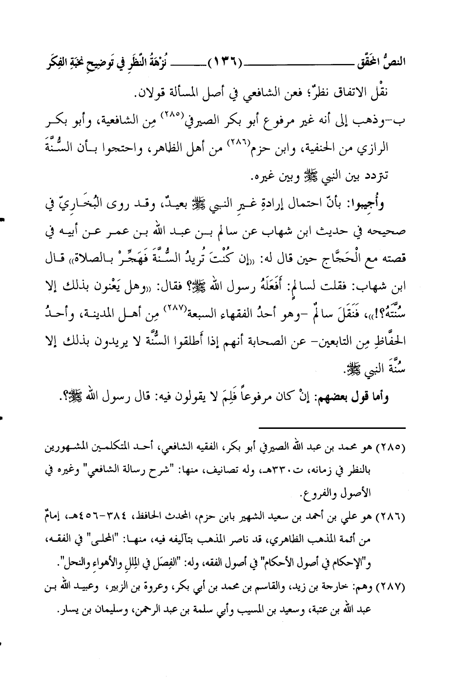 وأُجِيبوا: بأَنَّ احْتِمالَ إرادةِ غيرِ النبي صلى الله عليه وسلم بعيدٌ، وقد روى البُخَارِيّ في صحيحِه في حديثِ ابنِ شِهابٍ عن سالِمِ بنِ عبدِ اللهِ بنِ عُمَرَ عن أَبيهِ في قصَّتِه معَ الْحَجَّاج حينَ قالَ لهُ: إِنْ كُنْتَ تُريدُ السُّنَّةَ فَهَجِّرْ بالصلاة قالَ ابنُ شِهابٍ: فقلتُ لسالمٍ: أَفَعَلَهُ رسولُ الله صلى الله عليه وسلَّمَ؟ فقالَ: وهل يَعْنون بذلك إِلاَّ سُنَّتَهُ؟!، فَنَقَلَ سالمٌ -وهو أحدُ الفُقهاءِ السَّبعَةِ3 مِن أهل المدينة، وأحدُ الحفَّاظِ مِن التَّابعينَ- عنِ الصَّحابةِ أَنَّهم إِذا أَطلقوا السُّنَّة لا يُريدونَ بذلك إِلاَّ سُنَّةَ النبيِّ صلى الله عليه وسلم.