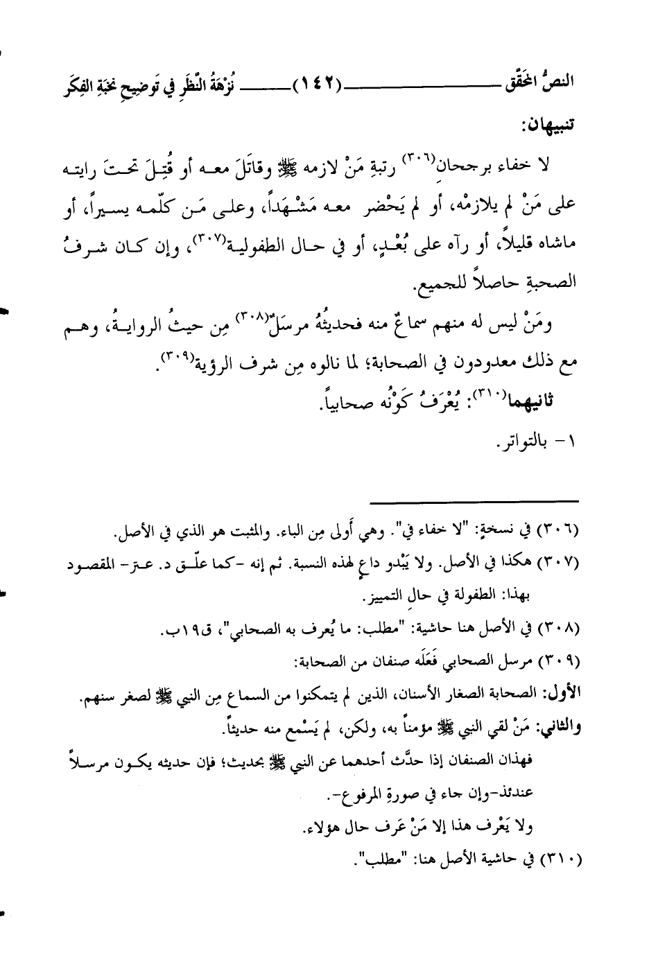 لا خَفاءَ برجحانِ1 رتبةِ مَنْ لازَمَه صلَّى الله عليه وسلَّمَ وقاتَلَ معَهُ أَو قُتِلَ تحتَ رايتِه على مَنْ لم يلازمْه، أَو لم يَحْضر معه مَشْهَداً، وعلى مَن كلَّمَهُ يَسيراً، أَو ماشاهُ قَليلاً، أَو رآه على بُعْدٍ، أو في حال الطفولية2، وإن كان شرفُ الصحبةِ حاصلاً للجميع.