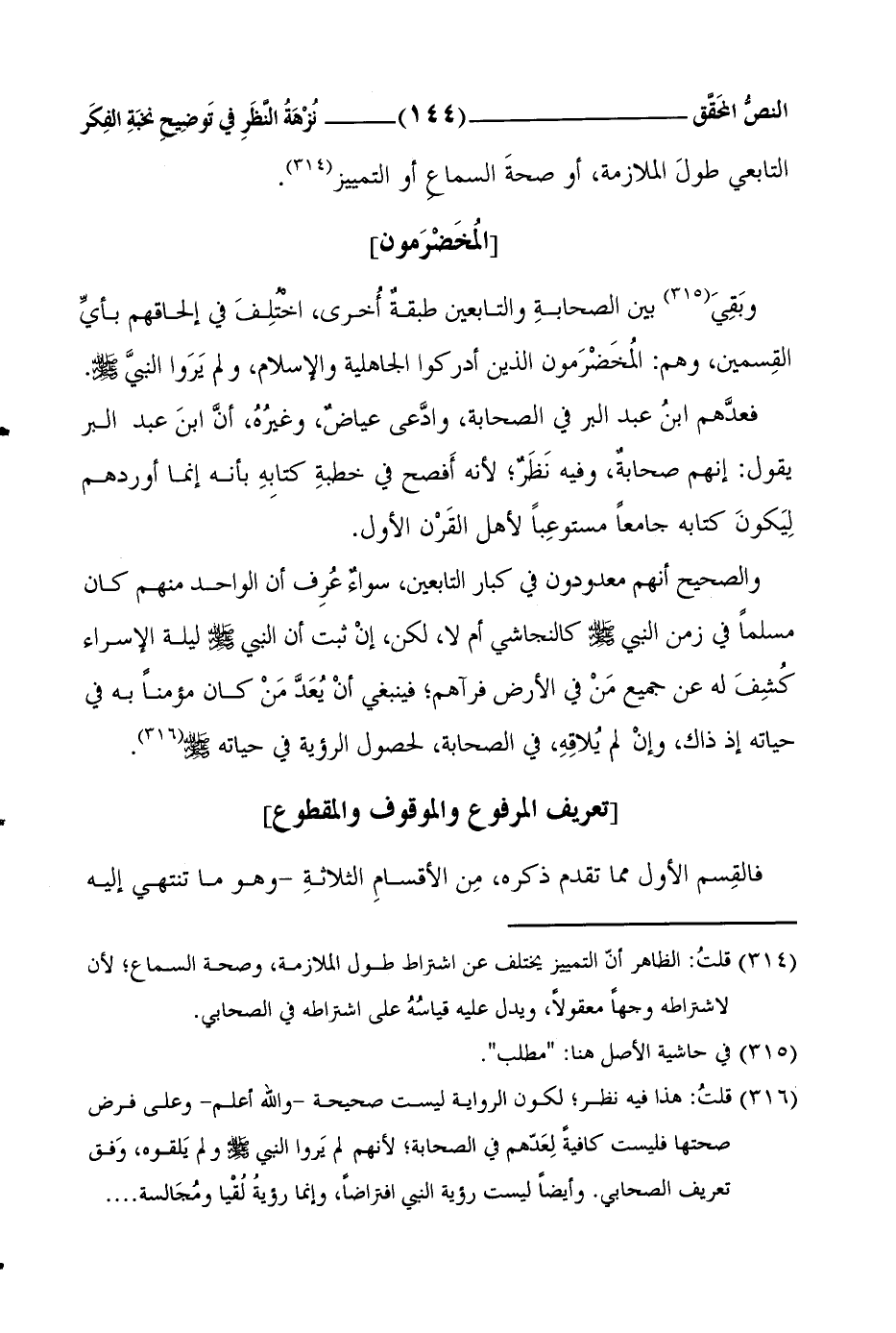 وبَقِيَ1 بين الصحابةِ والتابعين طبقةٌ أُخرى، اخْتُلِفَ في إِلحاقِهِم بأيِّ القِسمين، وهُم: المُخَضْرَمون الذين أدركوا الجَاهِليَّةَ والإِسلامَ، ولم يَرَوا النبيَّ صلى الله عليه وسلم.
