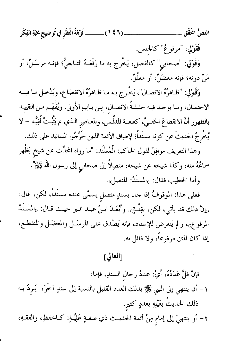 وَقَوْلي: "ظاهرُهُ الاتصال"، يَخْرج به ما ظاهرُهُ الانقطاعُ، ويَدْخل ما فيه الاحتمالُ، وما يوجَدُ فيه حقيقةُ الاتصالِ، مِن بابِ الأَولى. ويُفْهَم مِن التَّقييدِ بالظُّهورِ أنَّ الانقطاعَ الخفيَّ، كعنعَنَةِ المدلِّس، والمعاصِرِ الذي لم يَثْبُتْ لُقِيُّه = لا يُخْرِجُ الحديثَ عن كونِه مسنَداً؛ لإِطباقِ الأئمَّةِ الَّذينَ خَرَّجُوا المسانيد على ذلك.