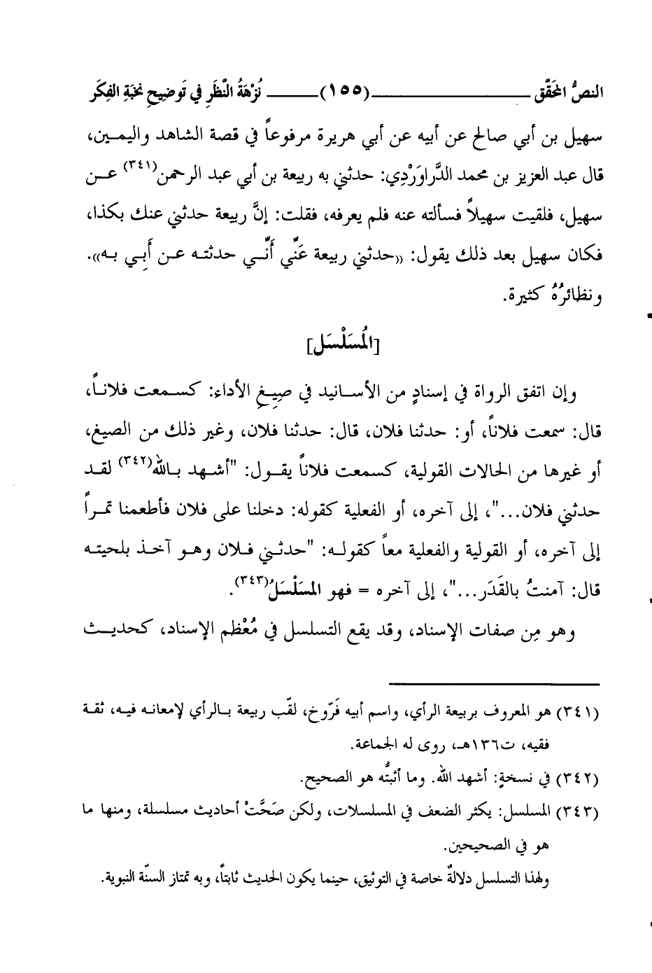 سُهَيْلِ بنِ أَبي صالحٍ عن أَبيهِ عن أَبي هُريرةَ مرفوعاً في قِصَّةِ الشَّاهِدِ واليَمينِ، قالَ عبدُ العزيزِ بنُ محمَّدٍ الدَّراوَرْدِي: حدَّثني بهِ ربيعةُ بنُ أَبي عبدِ الرحمنِ1 عن سهيل، فلقيتُ سُهيلاً فسأَلتُه عنهُ فلم يَعْرِفْهُ، فقلتُ: إنَّ ربيعةَ حدَّثني عنكَ بكذا، فكانَ سُهَيْلٌ بعد ذلك يقول: حدثني ربيعةُ عَنِّي أَنِّي حدَّثتُه عن أَبِي بهِ. ونظائرُهُ كثيرة.