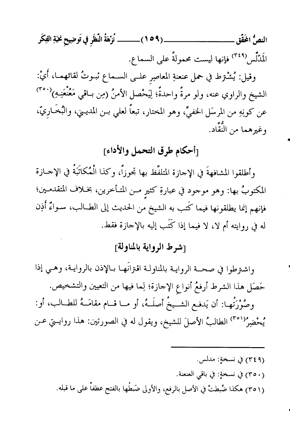 وأَطْلَقُوا المشافهةَ في الإِجازَةِ المتلفَّظ بِها تجوُّزاً، وَكذا الْمُكاتَبَةُ في الإِجازَةِ المكتوبُ بِها: وهُو موجودٌ في عبارةِ كثيرٍ مِن المُتأَخِّرينَ، بخلافِ المتقدمين؛ فإنهم إنما يطلقونها فيما كَتب بهِ الشَّيخُ مِن الحديثِ إِلى الطَّالبِ، سواءٌ أَذِن لهُ في رِوايتِه أَم لا، لا فيما إذا كَتَب إليه بالإجازة فقط.