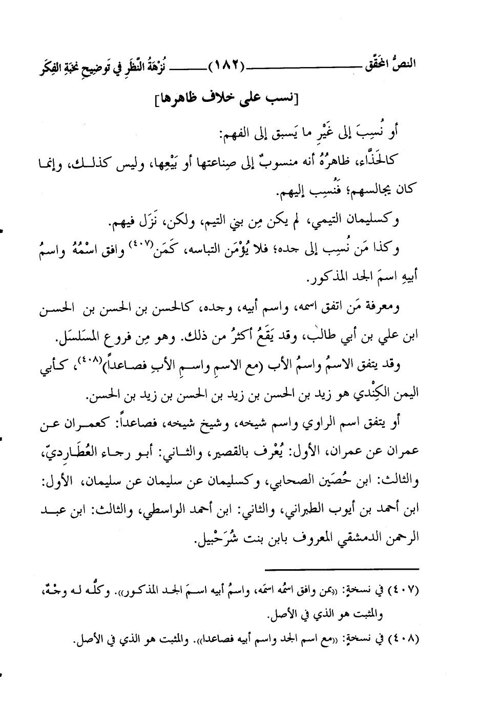 أو يتفق اسمُ الرَّاوي واسمُ شيخِهِ، وشَيْخِ شَيْخِهِ، فصاعِداً: كعمران عن عمران عن عمران، الأول: يُعْرف بالقَصِيرِ، والثَّاني: أبو رَجاءٍ العُطَارِديّ، والثَّالثُ: ابنُ حُصَين الصحابي، وكسُليمانَ عن سُليمانَ عن سُليمانَ، الأوَّلُ: ابنُ أحمدَ بنِ أيوبَ الطَّبرانيُّ، والثَّاني: ابنُ أَحمدَ الواسطيُّ، والثَّالثُ: ابنُ عبد الرحمنِ الدِّمشقيُّ المعروفُ بابن بنت شُرَحْبيل.