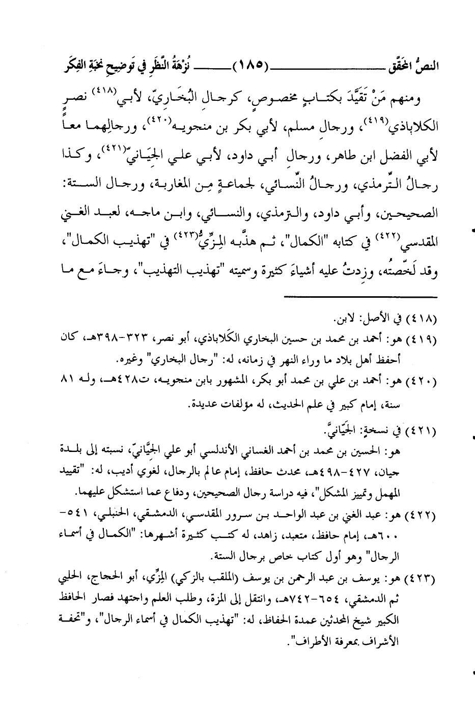 ومنهم مَنْ تَقَيَّدَ بكتابٍ مخصوصٍ، كرجالِ البُخَارِيّ، لأبي1 نصرٍ الكلاباذي2، ورجالِ مسلم، لأبي بكرِ بنِ مَنْجَوَيْهِ3، ورجالِهما معاً لأَبي الفضل ابن طاهر، ورجالِ أبي داودَ، لأبي عليٍّ الجِيَانيّ4، وكذا رجالُ التِّرمذي، ورجالُ النِّسائي، لجماعةٍ مِن المَغاربةِ، ورجالِ السِّتَّةِ: الصَّحيحينِ، وأَبي داودَ، والتِّرمذيِّ، والنَّسائيِّ، وابنِ ماجة، لعبدِ الغنيِّ المقدِسيِّ5 في كتابِه "الكمالِ"، ثمَّ هذَّبه المِزِّيُّ6 في "تهذيبِ الكَمالِ"، وقد لَخّصتُه، وزِدتُ عليهِ أشياءَ كثيرةً وسمَّيْتُه "تهذيب التَّهذيب"، وجاءَ معَ ما اشتَمَلَ عليهِ مِن الزِّياداتِ، قَدْرَ ثلثِ الأصلِ.