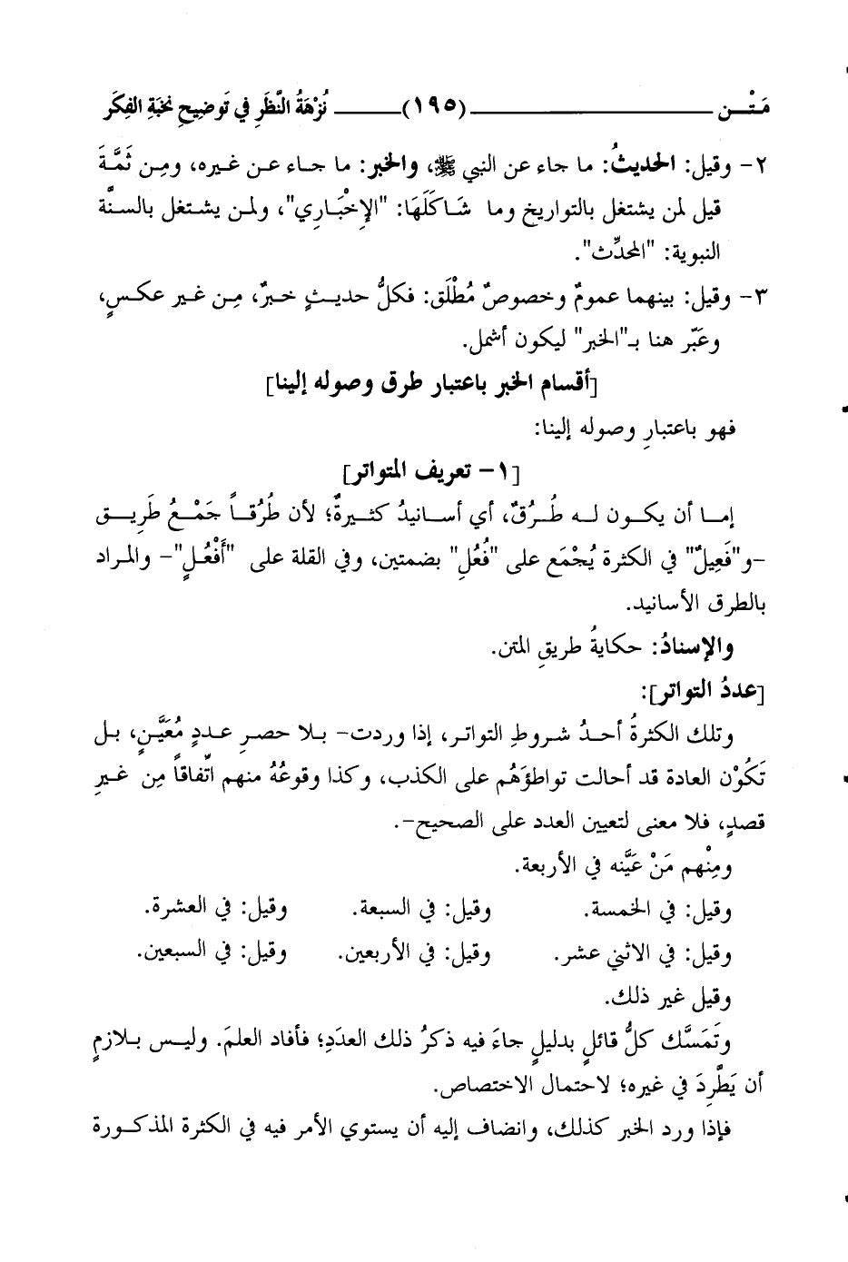 وتلكَ الكثرةُ أحدُ شروطِ التَّواتُرِ، إِذا وَرَدَتْ- بلا حصرِ عددٍ مُعَيَّنٍ، بل تَكُوْن العادةُ قد أحالتْ تواطؤَهُم على الكذِبِ، وكذا وقوعُهُ منهُم اتِّفاقاً مِن غيرِ قصدٍ، فلا مَعْنى لِتعْيينِ العَدَدِ على الصَّحيحِ-.