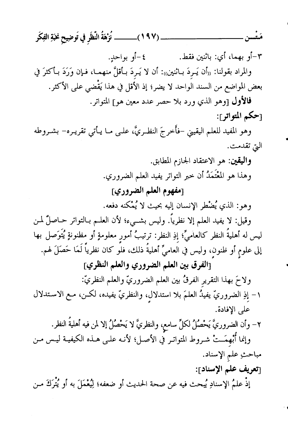وقيلَ: لا يُفيدُ العلمَ إِلاَّ نَظَرِيّاً. وليس بشيءٍ؛ لأنَّ العِلْم بالتَّواتُرِ حاصلٌ لمن ليس لهُ أهليةُ النَّظرِ كالعاميِّ؛ إِذِ النَّظرُ: ترتيبُ أمورٍ معلومةٍ أَو مظنونةٍ يُتَوَصل بها إلى علومٍ أَو ظنونٍ، وليس في العاميِّ أهليةُ ذلك، فلو كان نَظَرِيّاً لَمَا حَصَلَ لهُم.