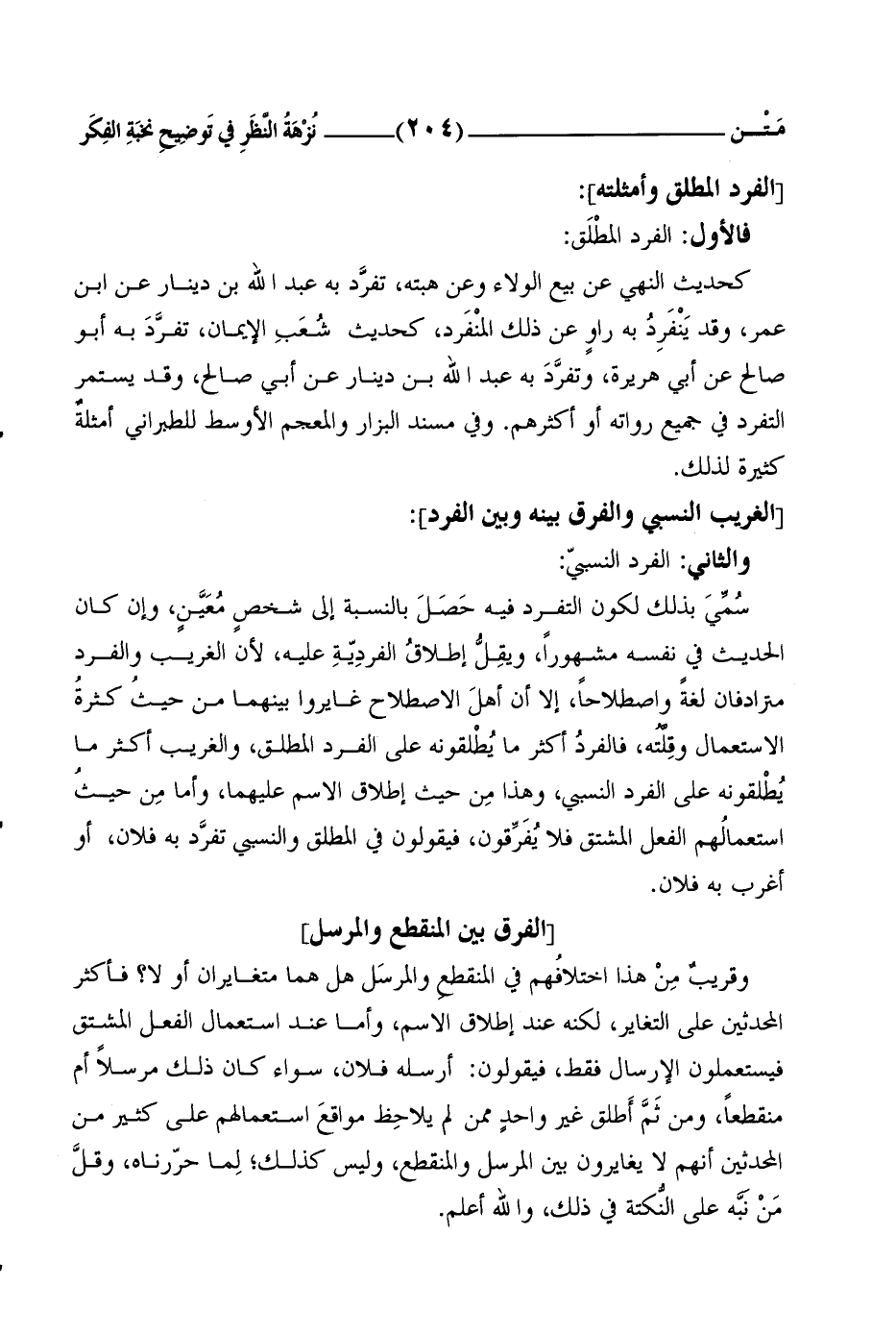 كَحديثِ النَّهْيِ عَنْ بيعِ الوَلاءِ وعَنْ هِبَتِهِ، تفرَّد بهِ عبدُ اللهِ بنُ دينارٍ عنِ ابنِ عمر، وقد يَنْفَرِدُ به راوٍ عن ذلك المنْفَرد، كحديث شُعَبِ الإيمان، تفرَّدَ بهِ أَبو صالحٍ عَنْ أَبي هُريرةَ، وتفرَّدَ بهِ عبدُ اللهِ بنُ دينارٍ عَنْ أَبي صالحٍ، وقدْ يَسْتَمِرُّ التفرُّدُ في جميعِ رواته أو أكثرهم. وفي مسند البزار والمعجم الأوسط للطبراني أمثلةٌ كثيرة لذلك.